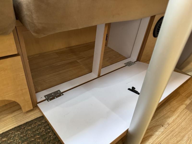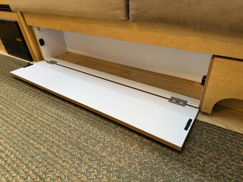 As you enter the travel trailer, along the front wall you will find a dinette/bed. Next to the dinette there is a comfortable lounge/bed with a LED TV above.