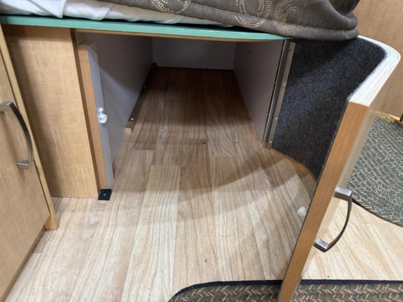 In the rear, you will find a bed with a wardrobe off the foot of the bed.