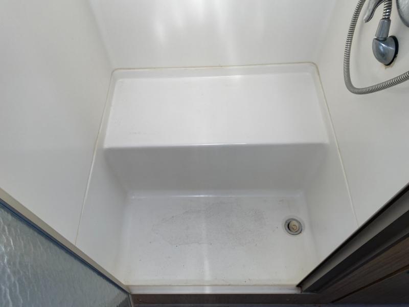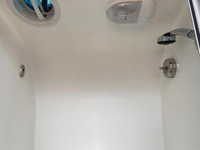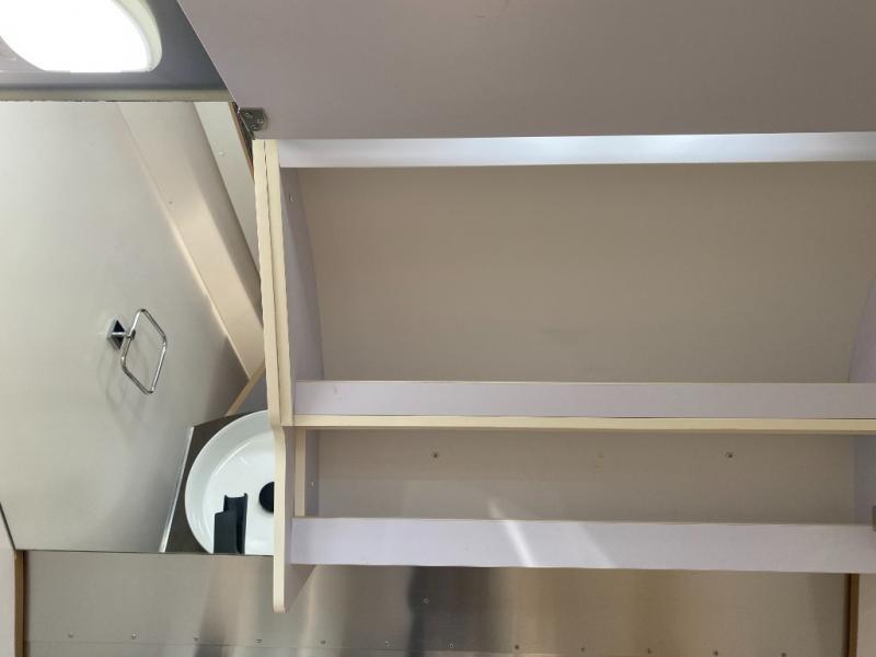 The bathroom has a private toilet area with a sink on one side of the trailer and a shower on the opposite side.