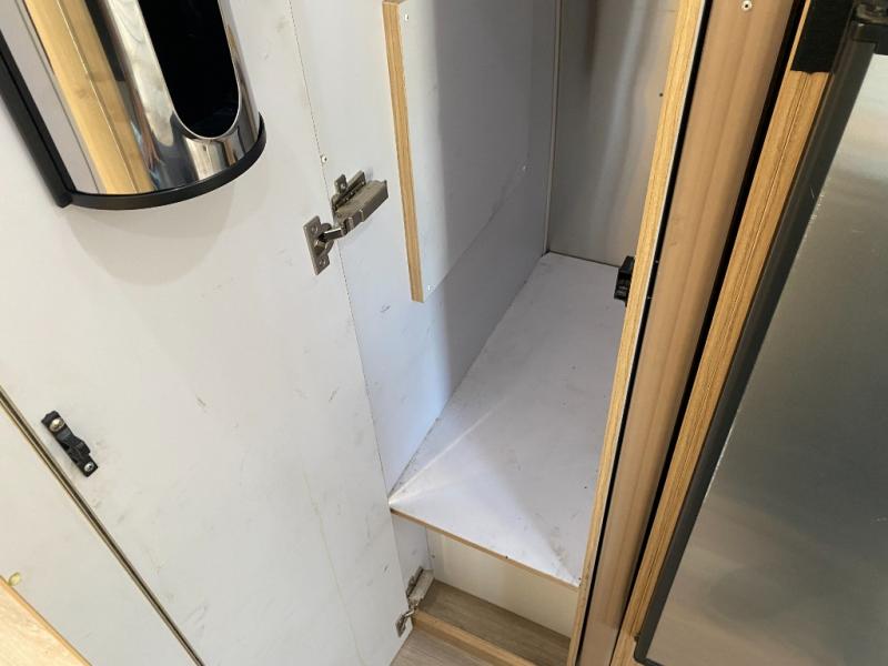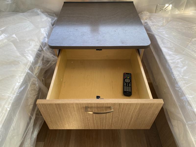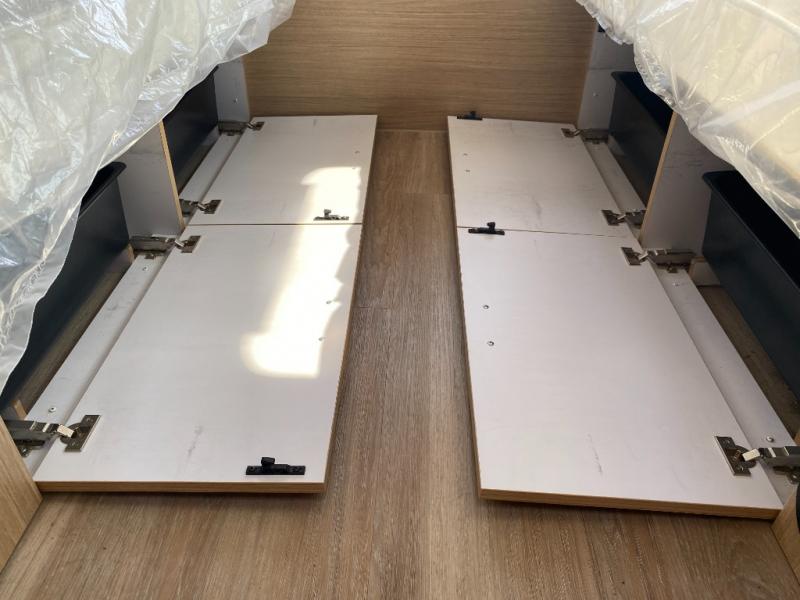In the rear, you will find the bedroom. There are twin beds with a nightstand with trunk. At the foot of each bed you will find a hanging wardrobe, and along one of the wardrobe walls there is a LED TV for your enjoyment, plus so much more!