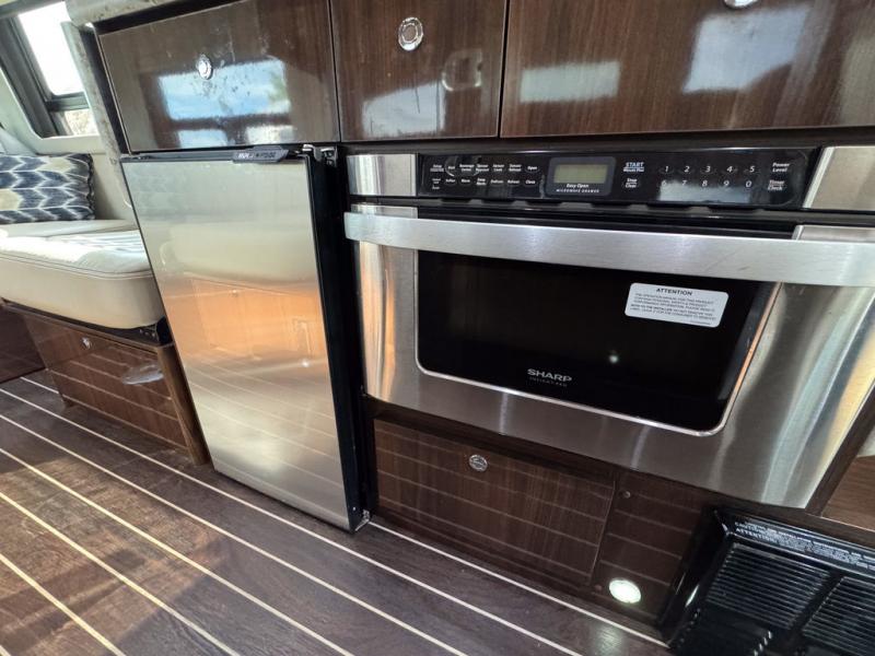 Step inside and find a convenient conversation area with the driver and passenger seats swiveled around and two additional lounge chairs, all with seat belts for safety while traveling. There is a removable table that can be placed in the center if you like, or in the pedestal holder further back in the coach.