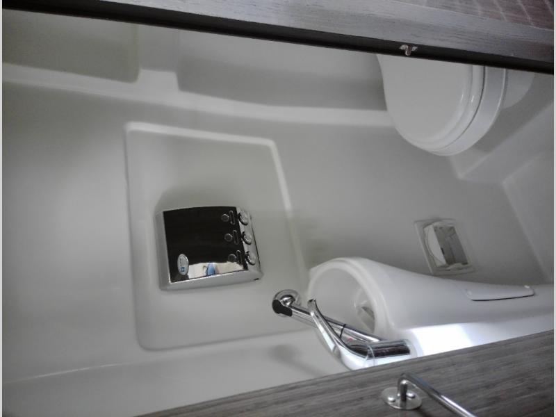 As you move toward the rear notice a convenient wet bath on your left including a toilet, small sink and shower.