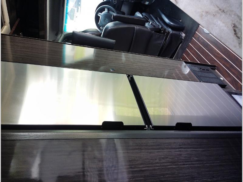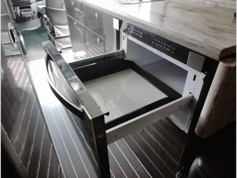 Step inside and find a convenient conversation area with the driver and passenger seats swiveled around and two additional lounge chairs, all with seat belts for safety while traveling. There is a removable table that can be placed in the center if you like, or in the pedestal holder further back in the coach.