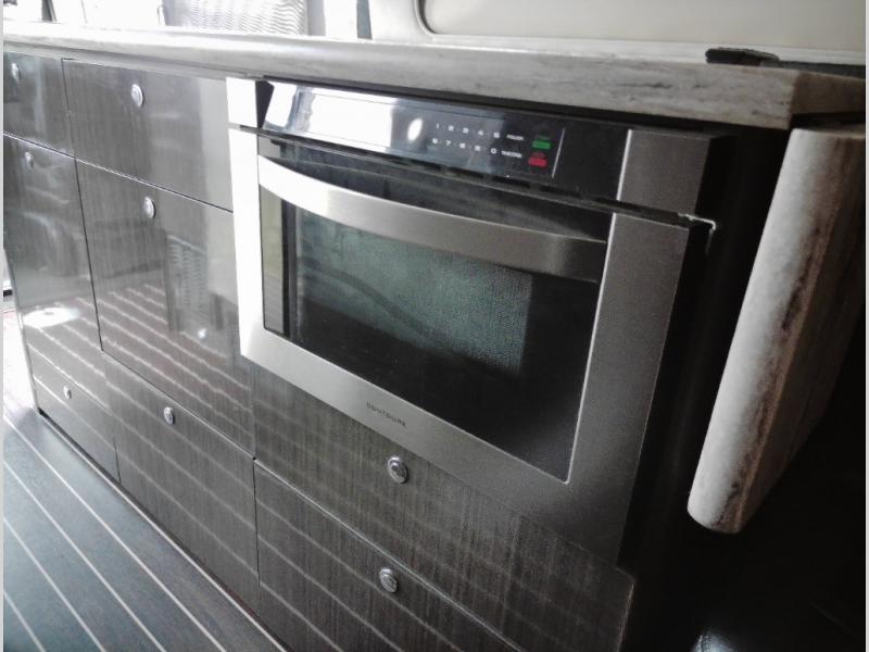 On the right side of the coach there is a round galley sink, overhead cabinets and a two burner cook-top, plus more.