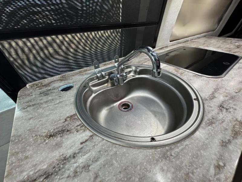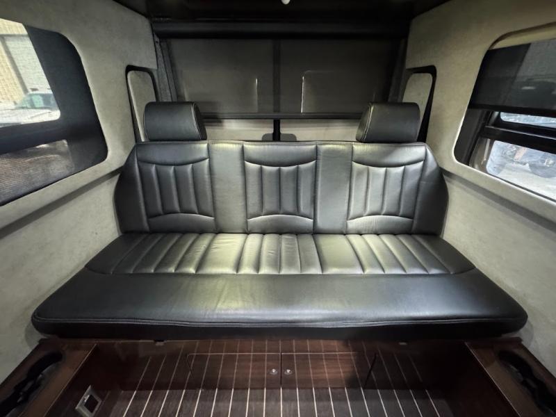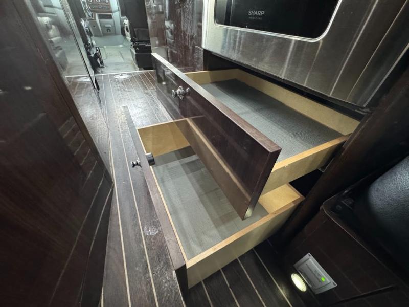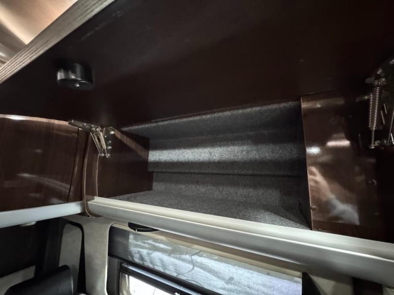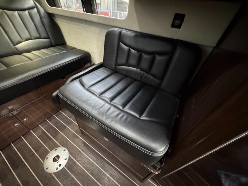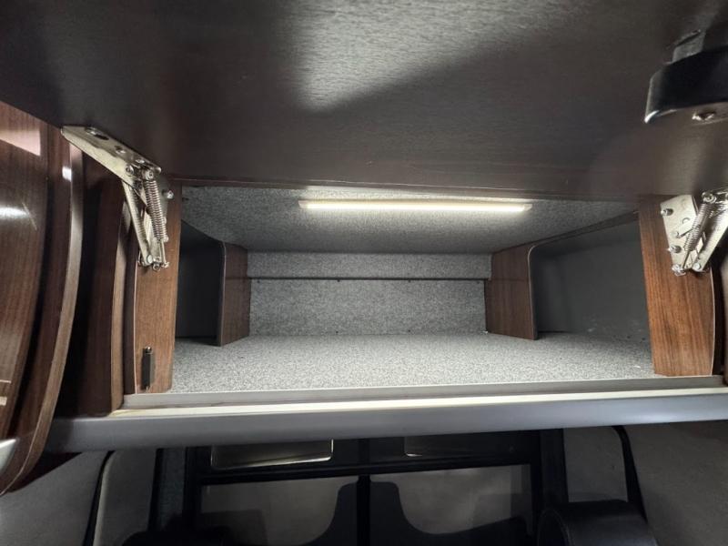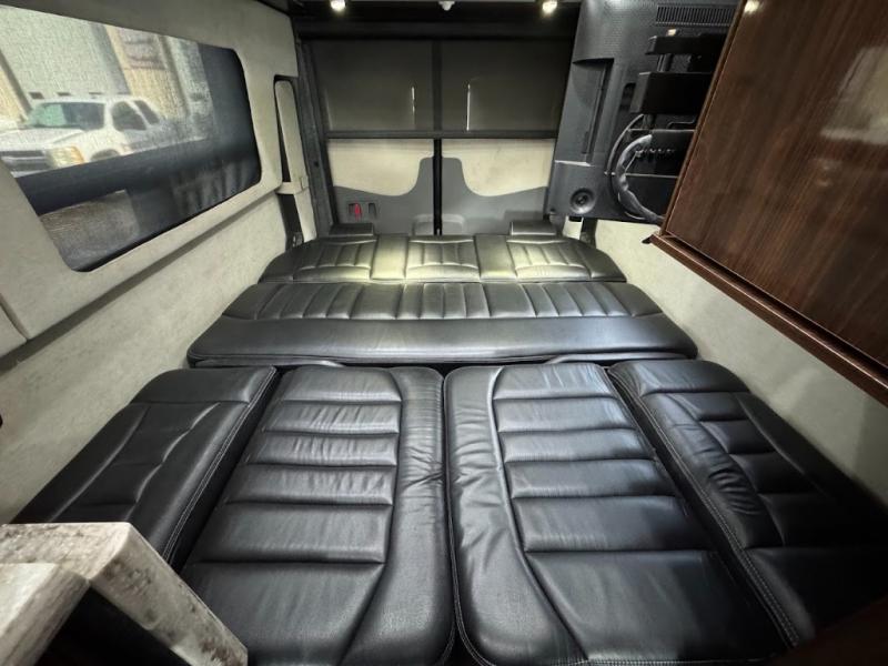 Step inside and find a convenient conversation area with the driver and passenger seats swiveled around. There is a removable table between the driver and passenger seat which allows for ease while eating or easy ability to play a game. Behind the driver's seat there is a work station and a LED TV.