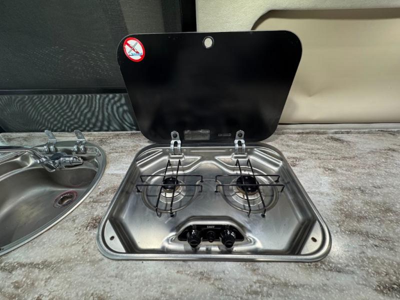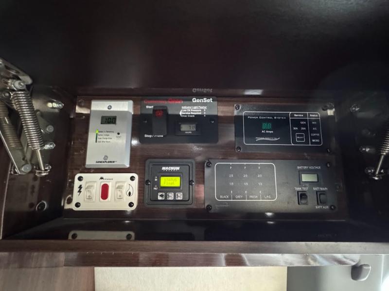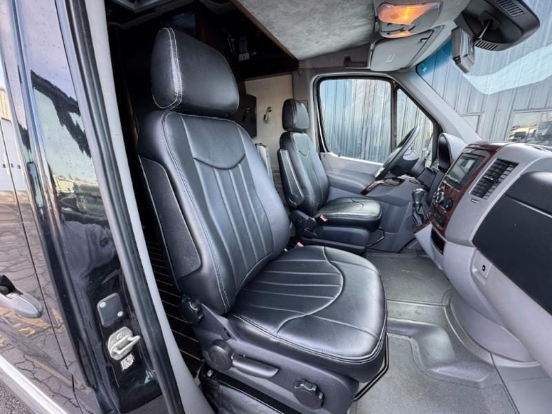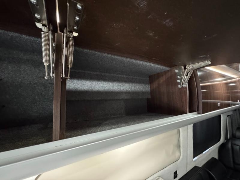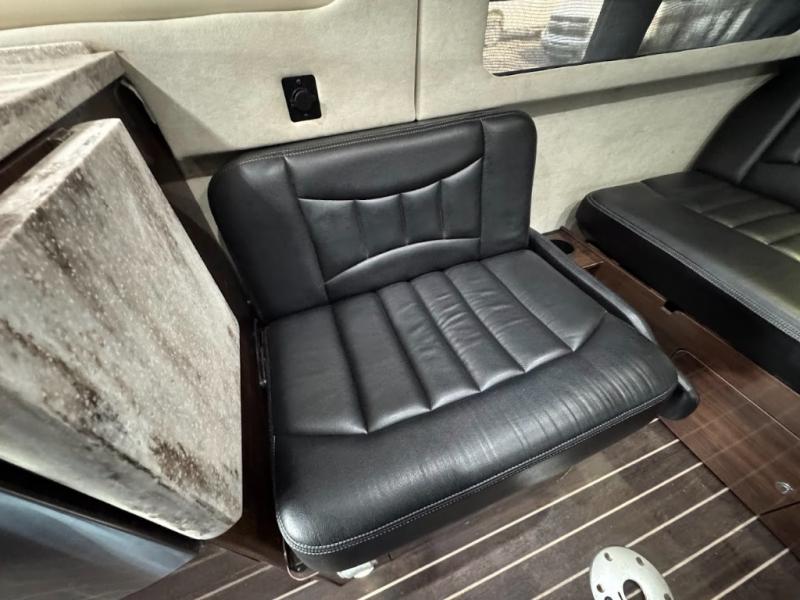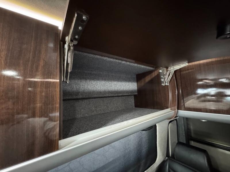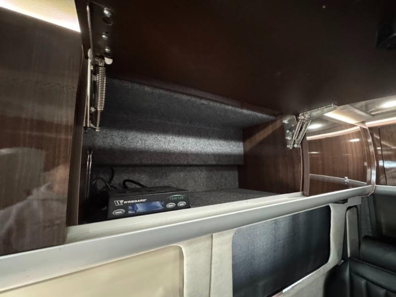 Step inside and find a convenient conversation area with the driver and passenger seats swiveled around. There is a removable table between the driver and passenger seat which allows for ease while eating or easy ability to play a game. Behind the driver's seat there is a work station and a LED TV.