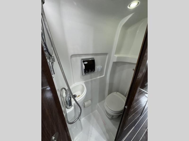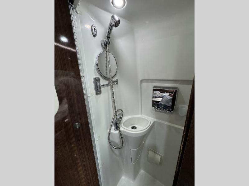 As you move toward the rear notice a convenient wet bath on your right which includes a toilet, small sink, and shower.