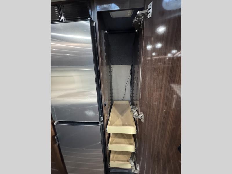 The galley has a sink, two burner range, and flip-up shelf along one side. The opposite side offers a large pantry and refrigerator with freezer.