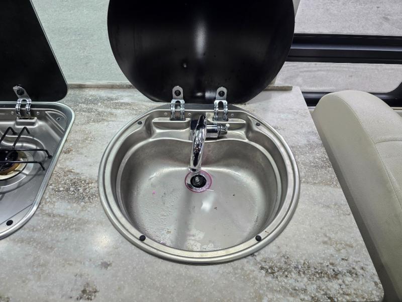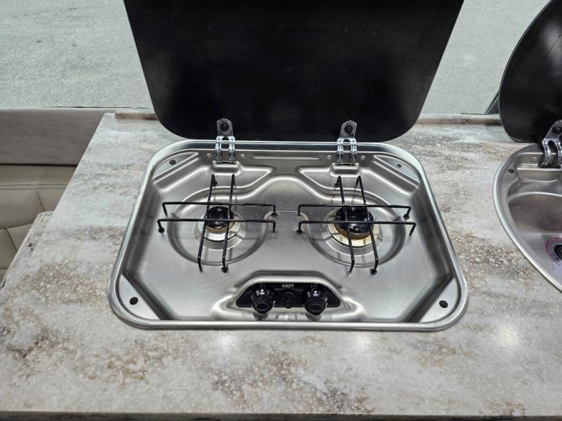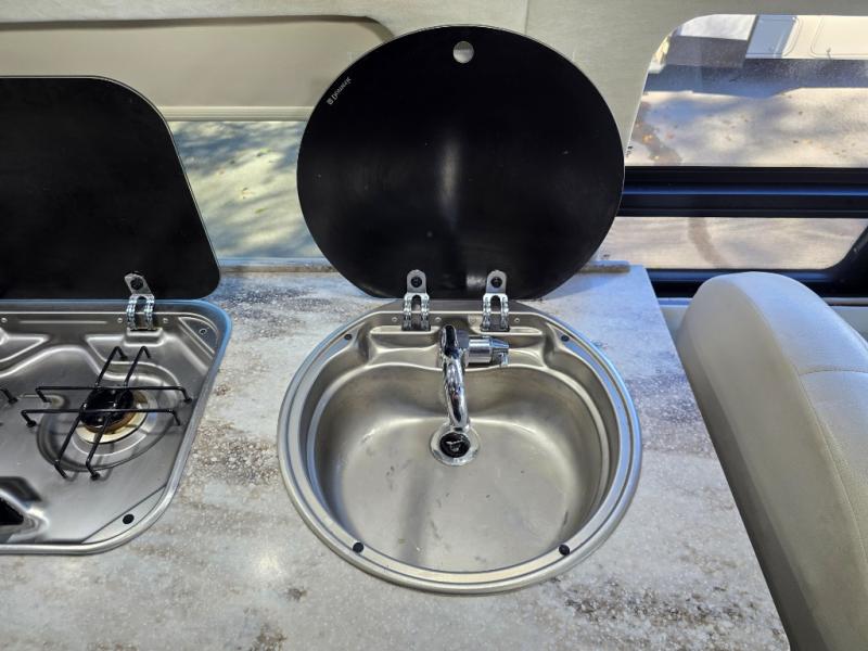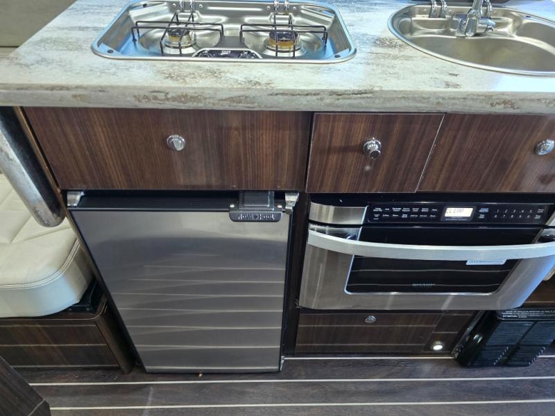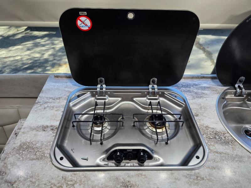 On the right side of the coach there is a round galley sink, overhead cabinets and a two burner cook-top, plus more.