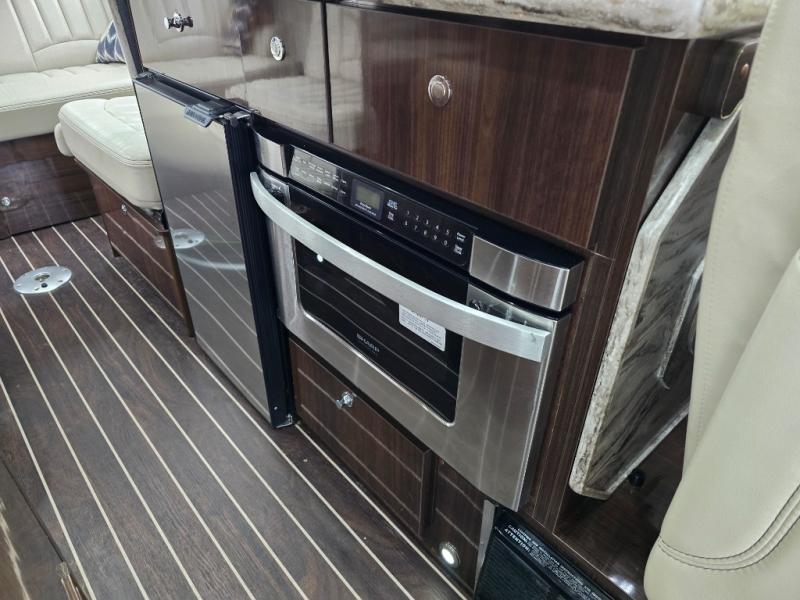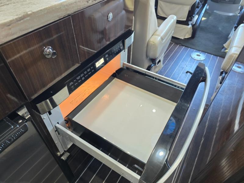 Step inside and find a convenient conversation area with the driver and passenger seats swiveled around and two additional lounge chairs, all with seat belts for safety while traveling. There is a removable table that can be placed in the center if you like, or in the pedestal holder further back in the coach.