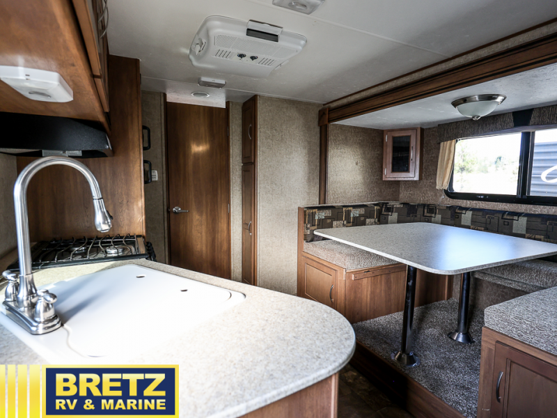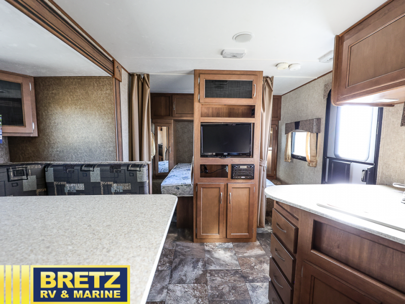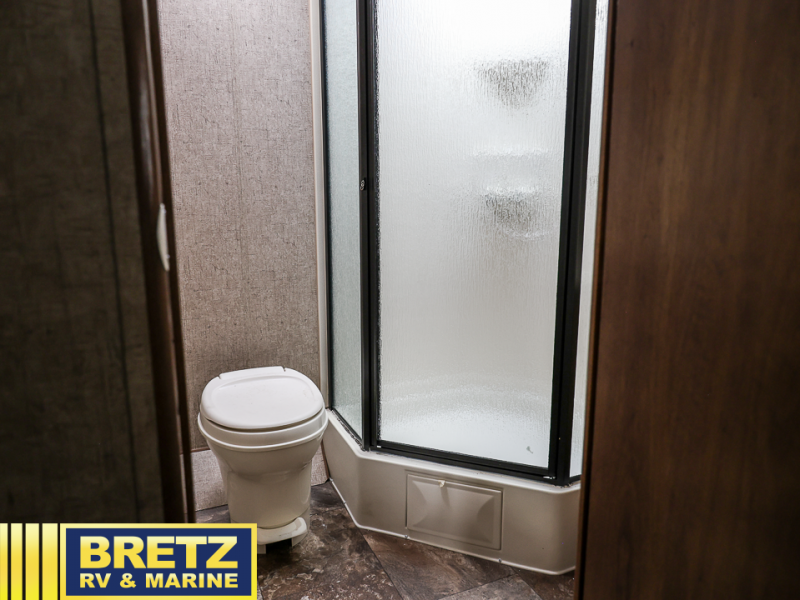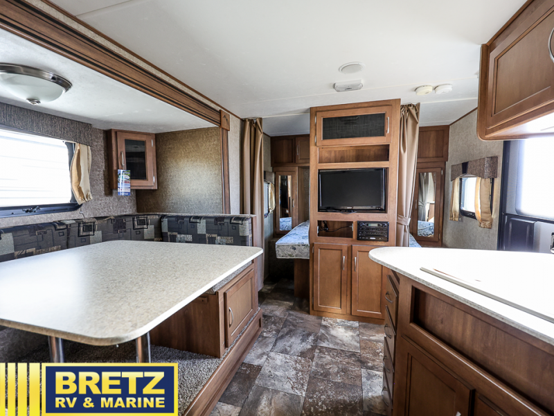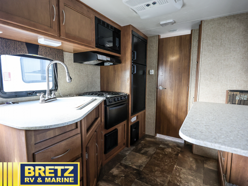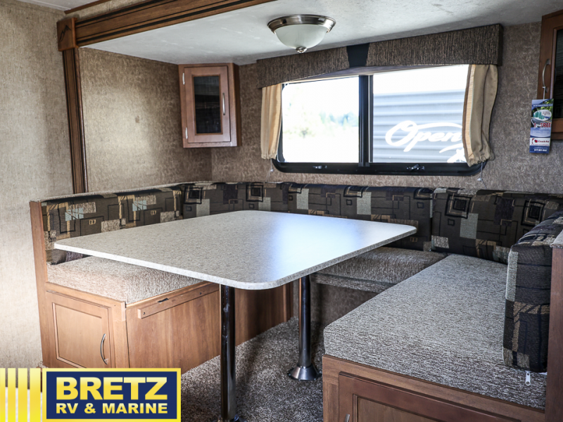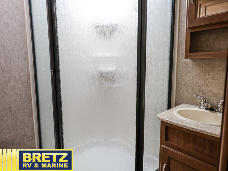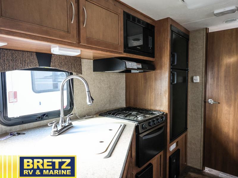 The main living area features a slide out u-shaped convertible dinette that is comfortable for dining or viewing the entertainment center. Enjoy cooking while you travel with a complete kitchen setup including a refrigerator, 3 burner range with overhead microwave, and double sink for doing the dishes. There is a pantry and overhead storage for your dry goods and anything else you might need.