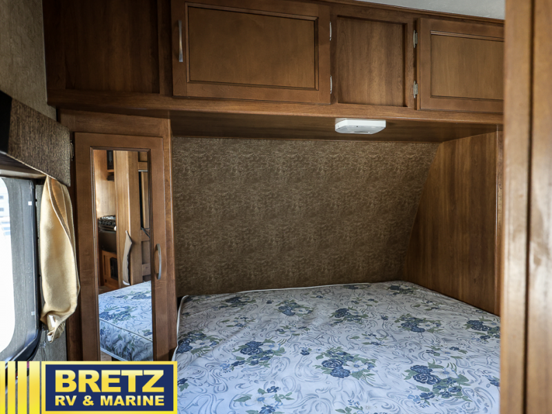 In the front you will see behind the entertainment center a comfy queen bed. With wardrobes and nightstands on both sides of the bed, plus a large overhead cabinet for extra storage you will have plenty of room. You can also pack things in the front pass-thru storage compartment that has two access doors.