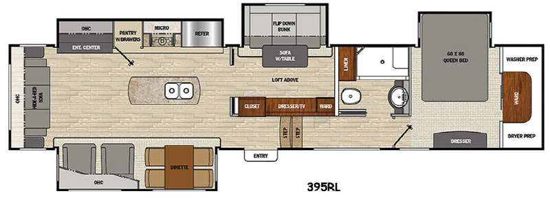 The opposite side slide out features an entertainment center adjacent to the sofa along with overhead storage for your things. There is also a pantry with drawers, a three burner range with overhead microwave oven, and refrigerator within this slide. The off set island provides added food prep space, plus a double kitchen sink.