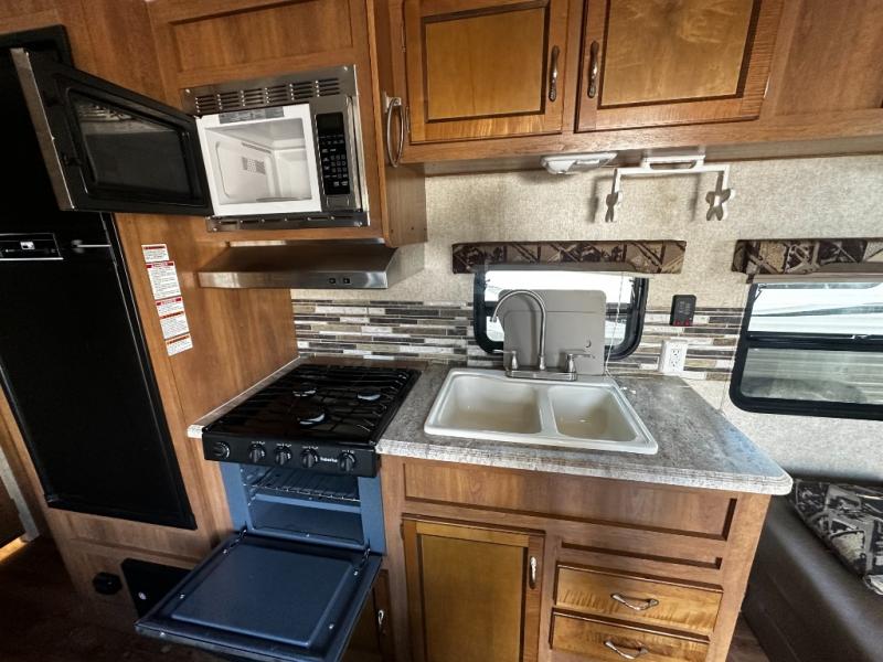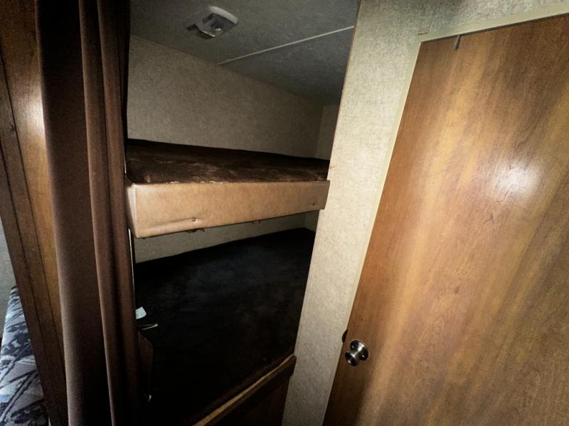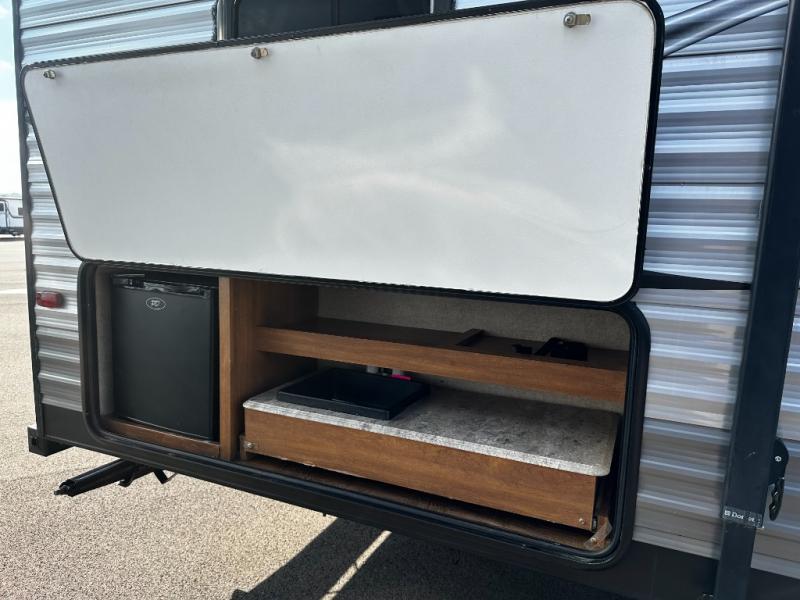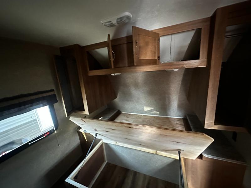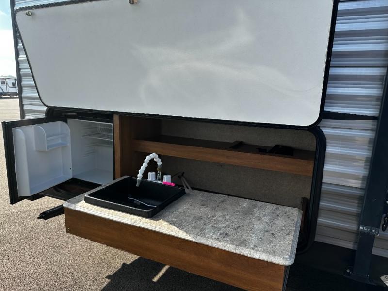 Before stepping inside check out the optional pull-out camp kitchen which would be located beneath the bunks. The kitchen provides a refrigerator, Coleman cooking grill, and single sink. There is also a pass-through storage compartment that you can access from either side near the front. This is the perfect place to stow away all of your outdoor gear, and things like fishing poles, golf clubs, and more.