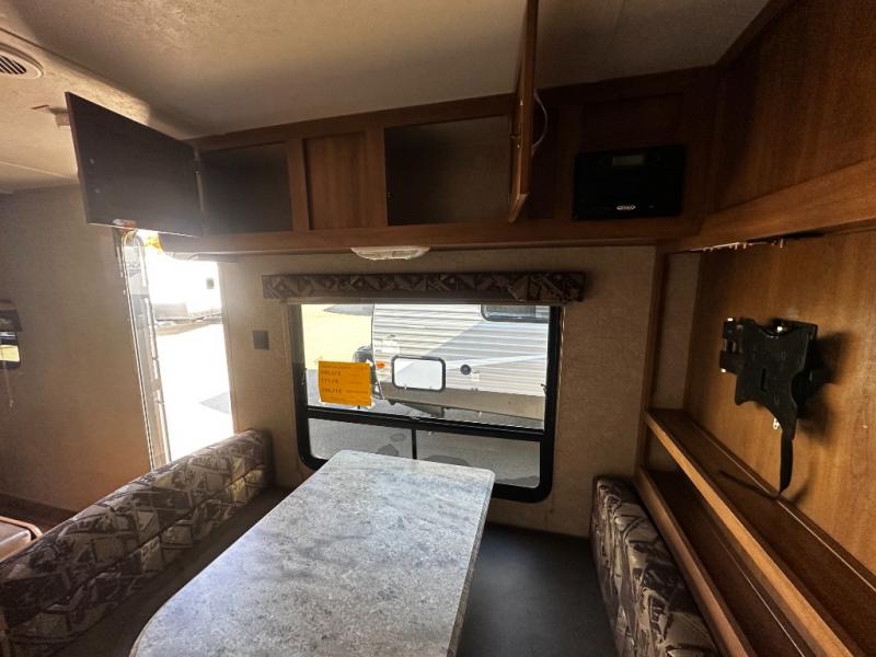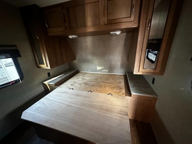 In the living area there is a sofa that runs width wise along the stub wall for added seating, plus there is a booth dinette for mealtime, or just hanging out on the curb side. A TV entertainment center is above the dinette on the interior wall.