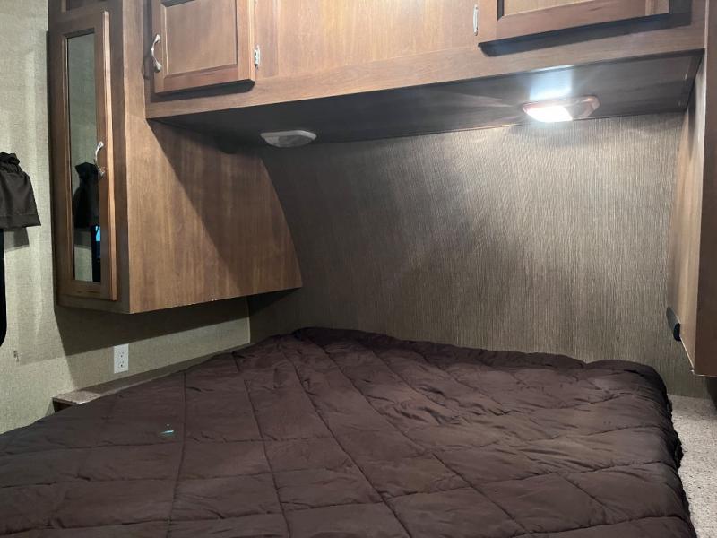Up front there is a bedroom which provides a queen bed, two wardrobes, and overhead cabinet storage above the head of the bed.