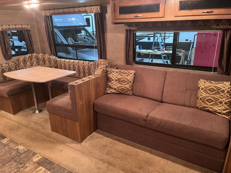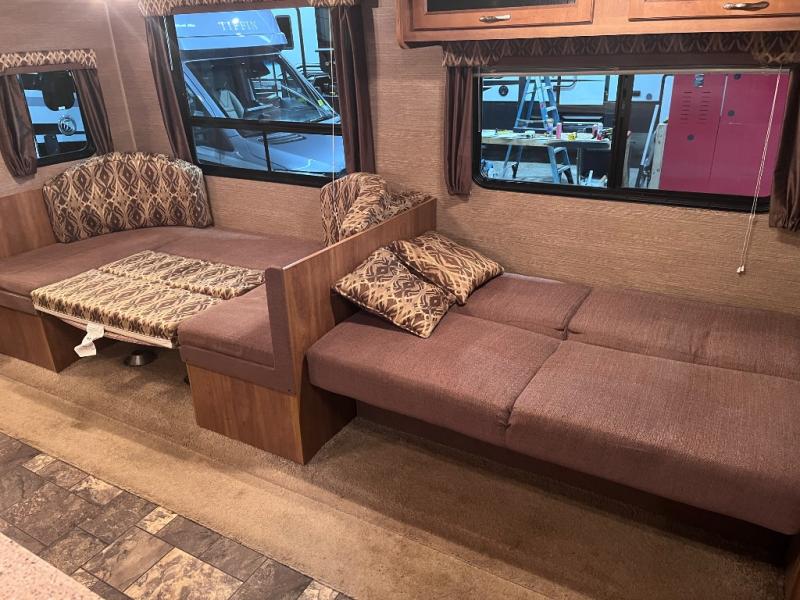 Opposite the door side there is a large slide featuring a sofa and u-shaped dinette which provides ample seating for everyone to enjoy dining, watching TV with the entertainment center nearby, or just hanging out.