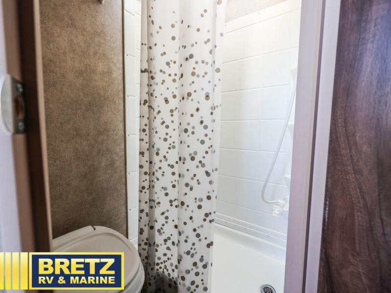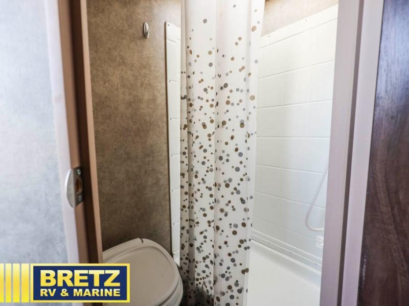 Step inside model 17FB and notice the handy wardrobe to your immediate left. Further in the door in the opposite rear corner find a bathroom with a 36" shower and toilet.