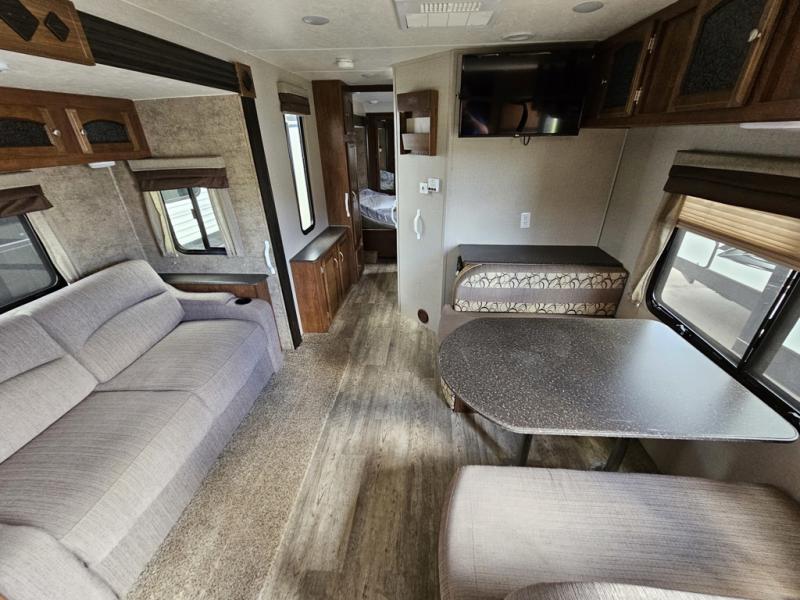 Straight in the door find a slide out sofa with end table including storage above, plus a pantry. More seating is available on the opposite side in the booth dinette that also features overhead cabinets, and a flat screen TV along the outer bathroom wall.