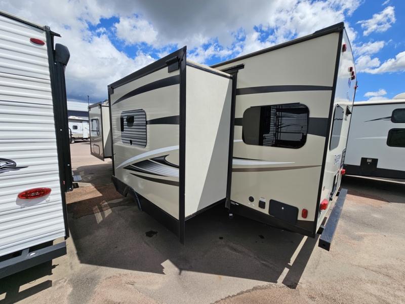 A sliding hallway door leads into the front private master bedroom which features its own exterior entry/exit door. Inside find a queen bed slide out, a dresser, and a full front wardrobe with exterior pass-through storage beneath, and so much more!