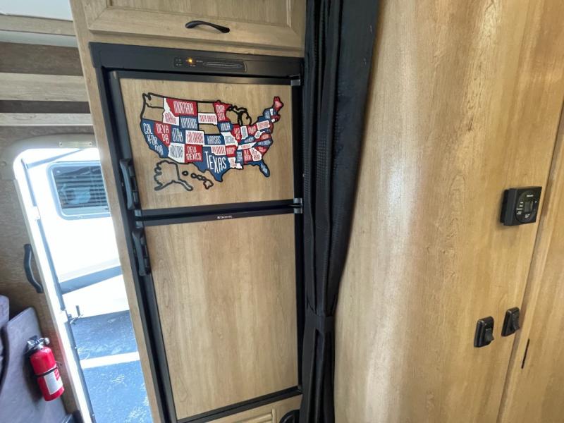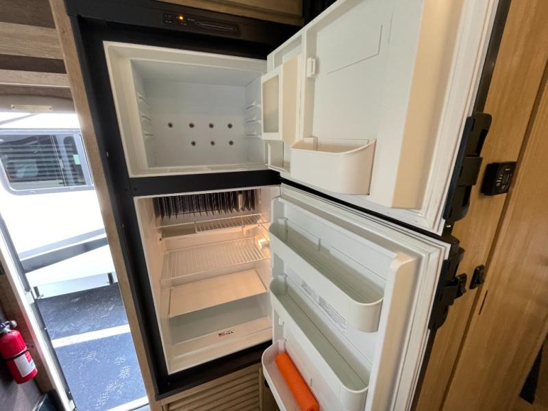 The kitchen is fully equipped for life on the road, featuring ample cabinetry, generous counter space, a refrigerator, microwave, and a three-burner cooktop. Whether you’re preparing a quick breakfast before heading out or cooking dinner after a day of exploring, this kitchen keeps everything within easy reach.