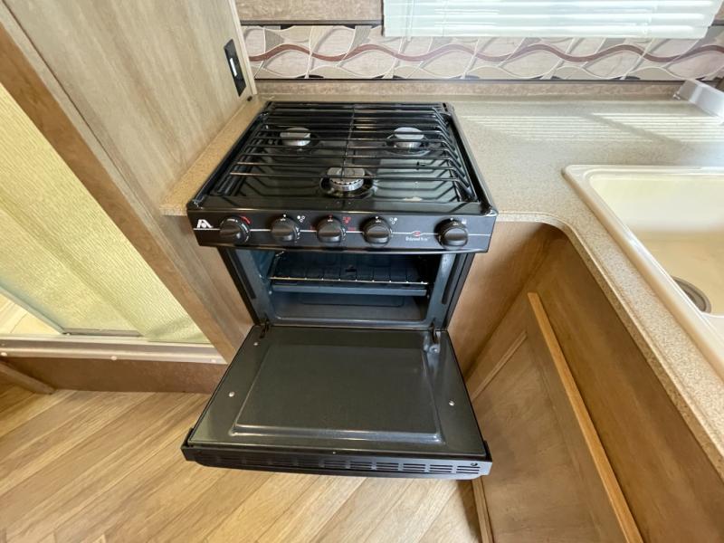 To the left of the side entry door find the refrigerator, and across from that is the rest of the kitchen amenities including a double sink, a three burner range, overhead microwave, and counter top extension. You will also find plenty of storage space for your dishes and things as well.
