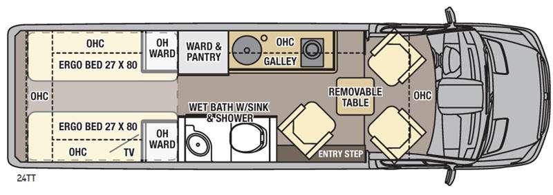 In the very back of this Galleria model 24TT you will find a set of twin Ergo beds that are 27" x 80", and each feature an overhead wardrobe at the foot of the bed. You will also find there is overhead cabinetry across the back and along both sides so you can keep things neat and organized. There is even a 24" LED TV to enjoy, plus so much more!