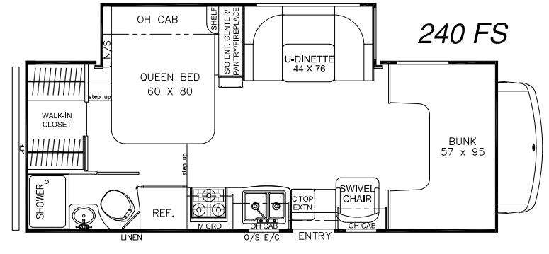 Enter along the passenger side just forward of mid-coach and find a swivel chair to your right. There is a 57" x 95" bunk above the cab area for added sleeping space. Straight ahead through the entry door find more seating at the slide out U-shaped dinette. Besides the dinette this slide also features a slide out (towards the interior) entertainment center including a pantry and fireplace to enjoy.
