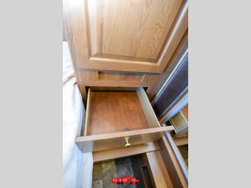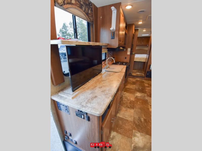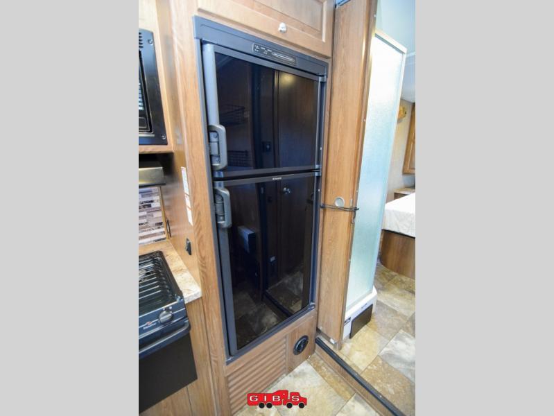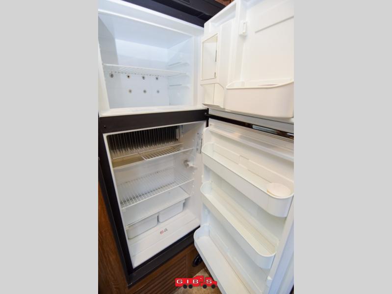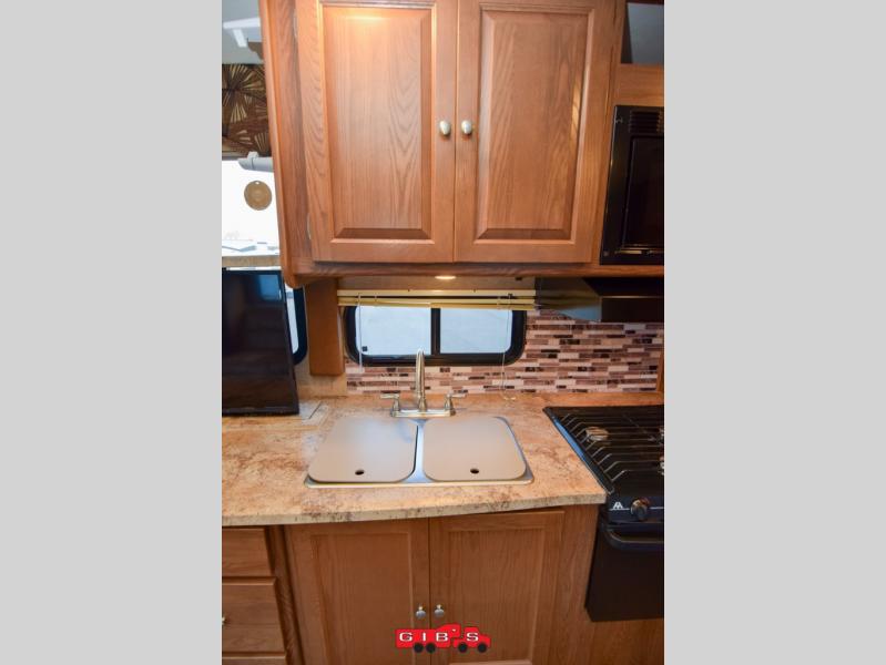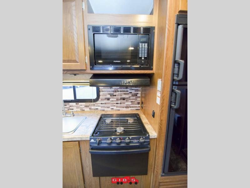 To the left of the entry door find all the kitchen amenities you need to prepare and cook food for your family on the move. There is a large counter area, double kitchen sink, three burner range with overhead microwave, and refrigerator. You will also find overhead storage, plus lower cupboards and drawers for all of your things.