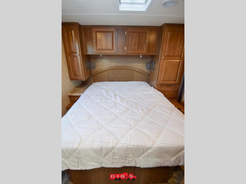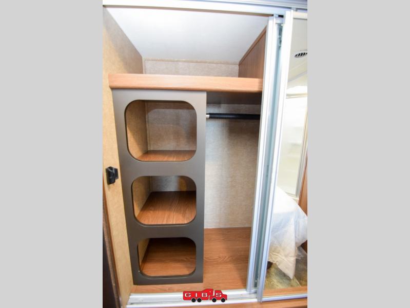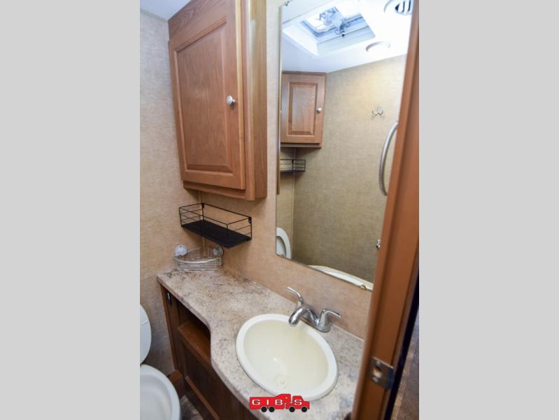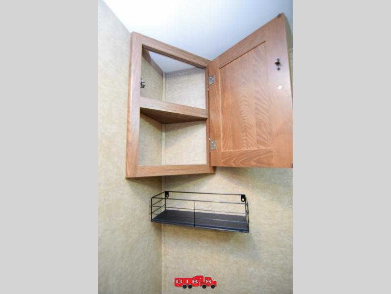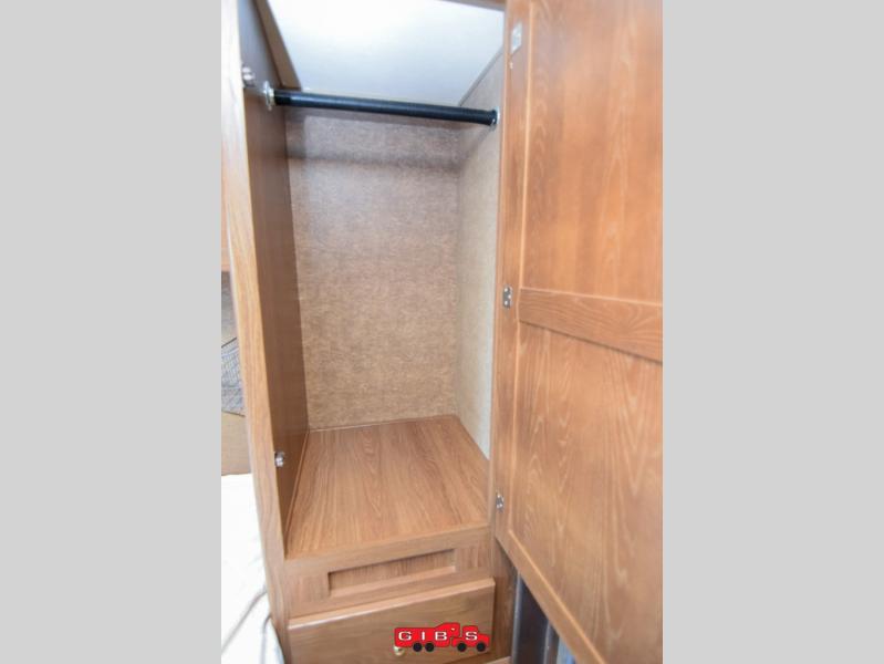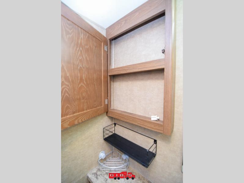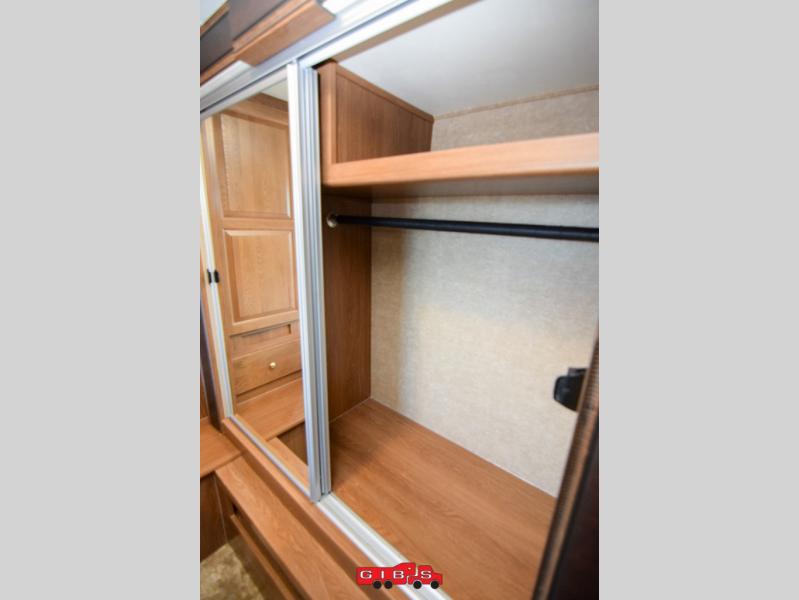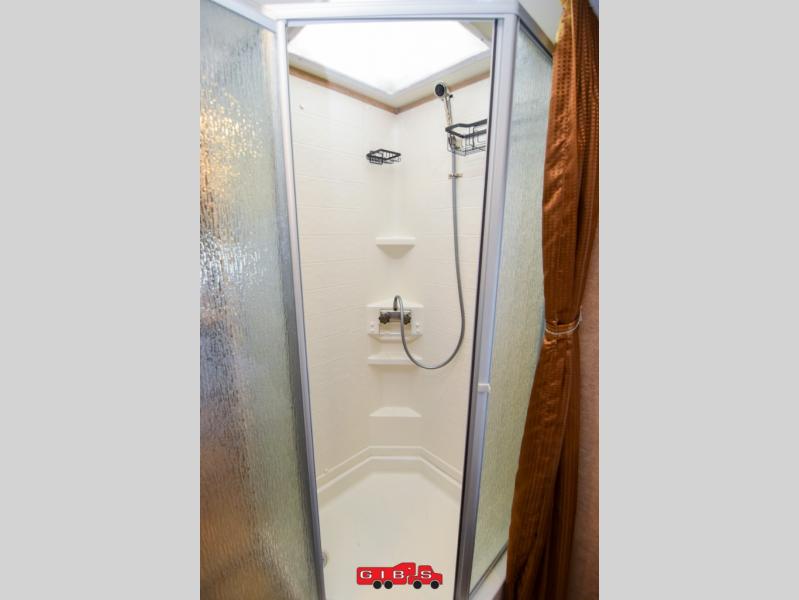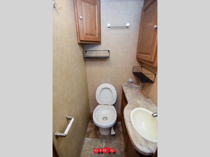 Head into the rear private bedroom and bath area combined. The shower is to the left as you enter, and a private toilet area with vanity and sink is on your right. The queen bed features a shirt closet and nightstand on one side and wardrobe for additional storage on the opposite side. There is also a slide out wardrobe, plus so much more!