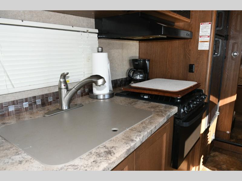 The fully equipped kitchen allows you to cook meals anywhere your travels take you. With a three-burner stove, microwave, refrigerator, double sink, and plenty of cabinet storage, you can prepare everything from quick breakfasts before hitting the road to hearty dinners after a day of adventure.