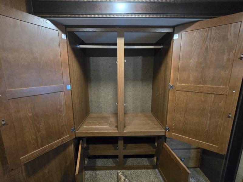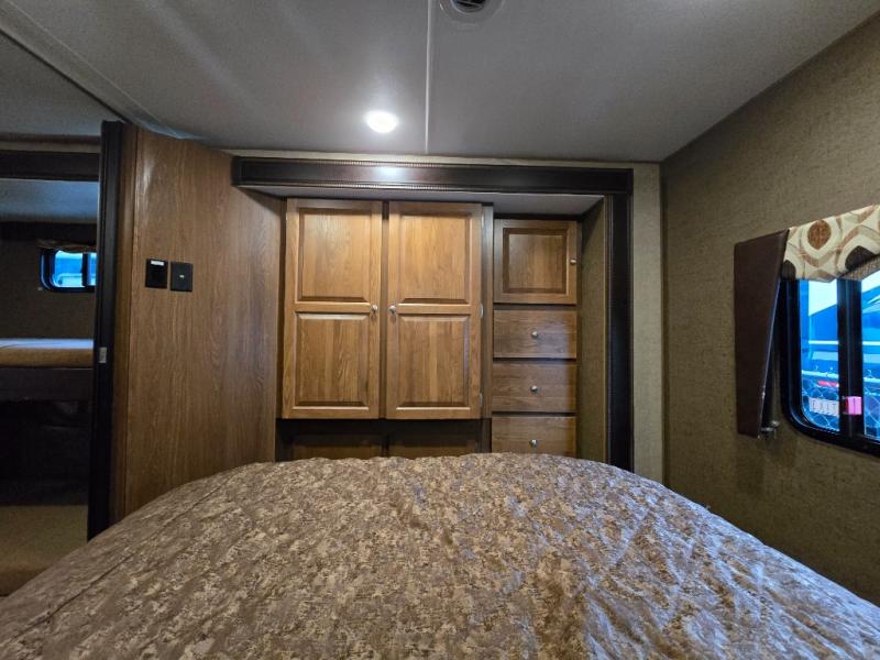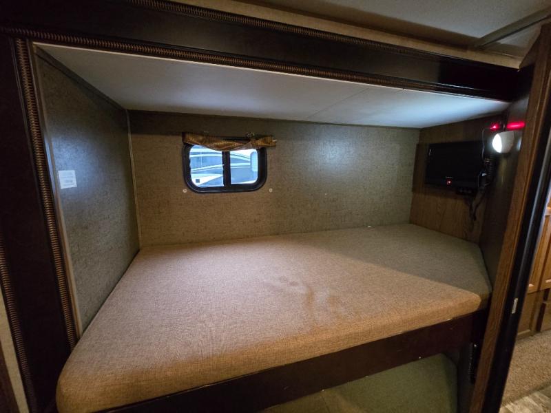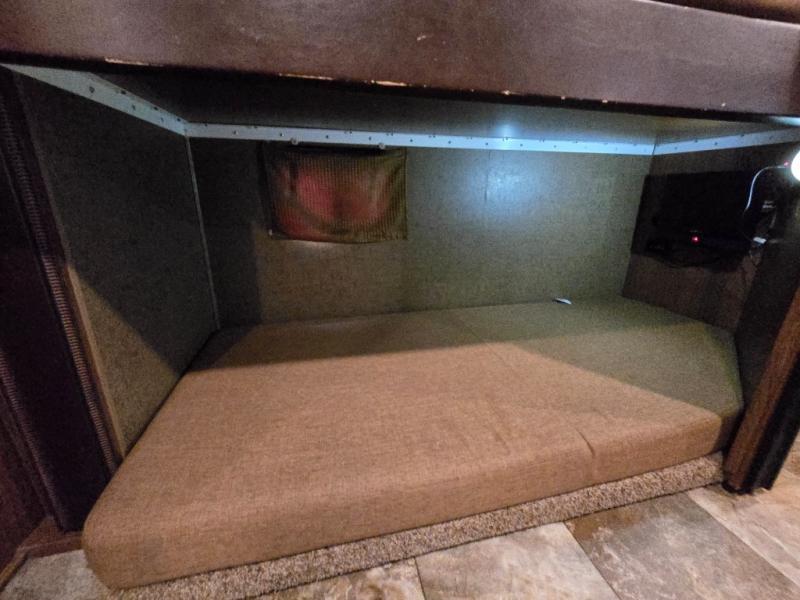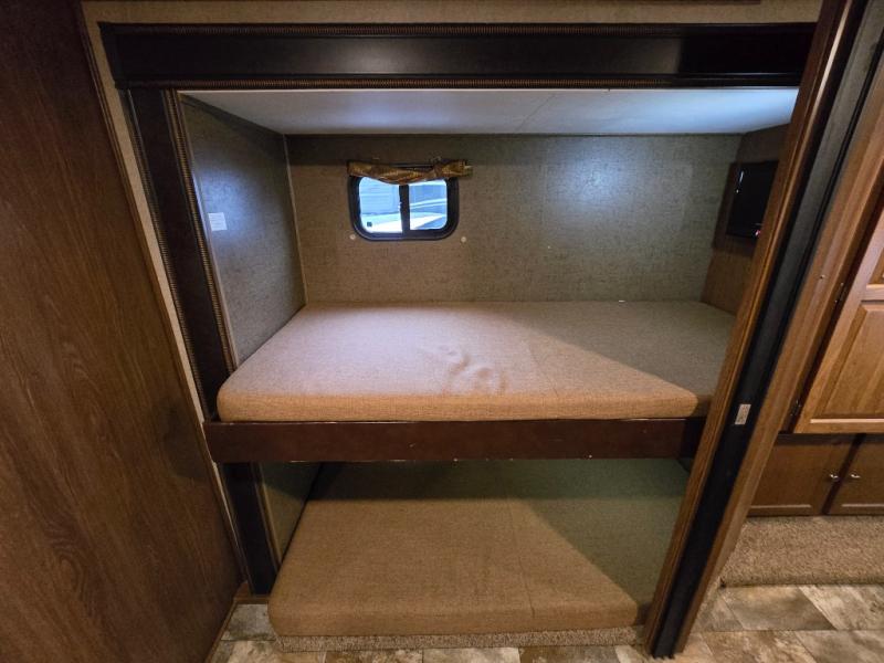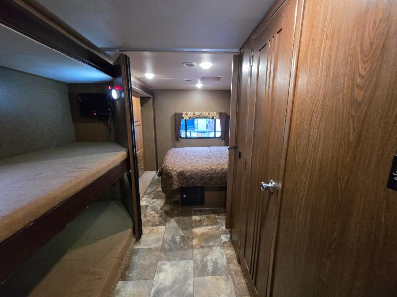 Heading toward the rear find a complete bath featuring a shower, toilet, sink, along with linen cabinet on the right side. Across the hall find a slide out set of bunk beds for the kids that is attached to the master bedroom wardrobe and dresser.