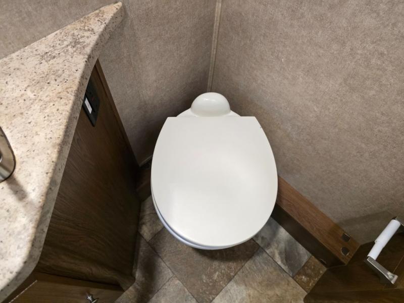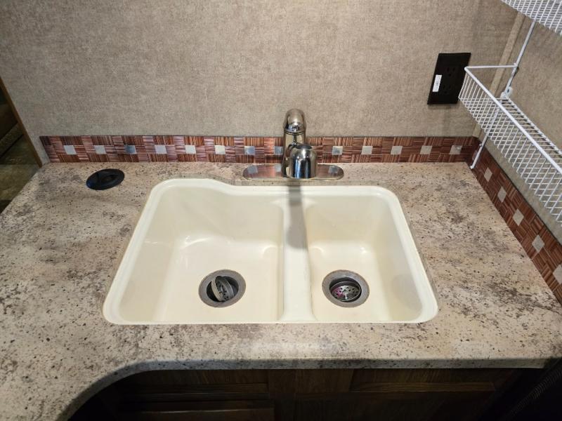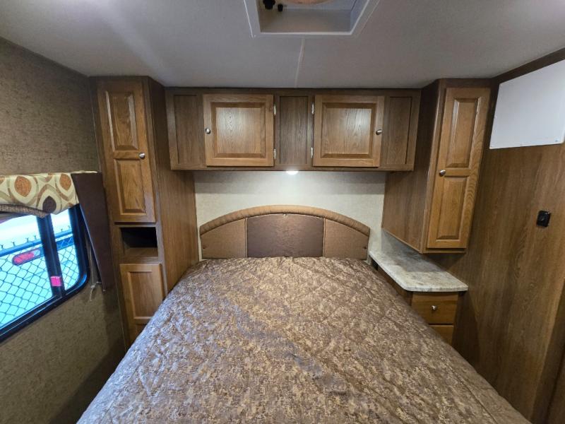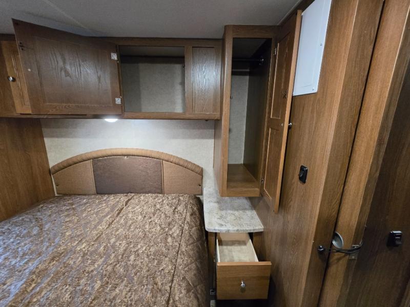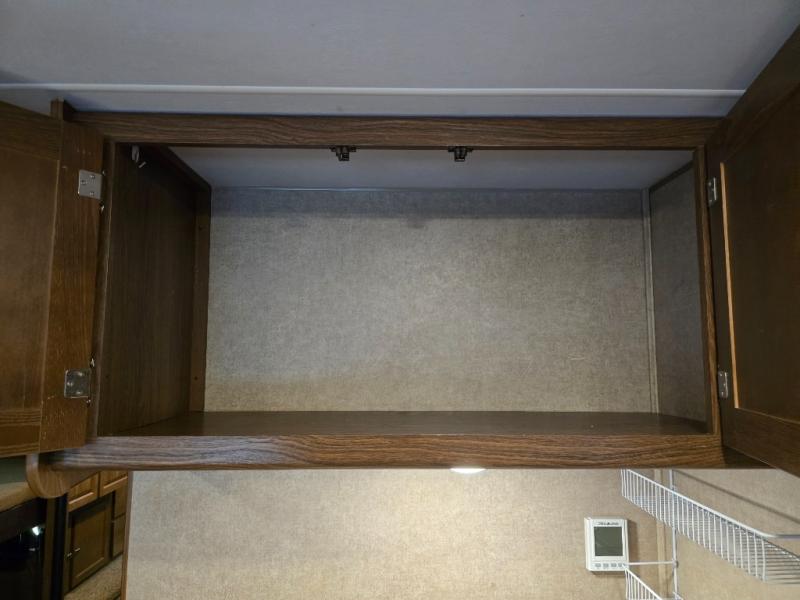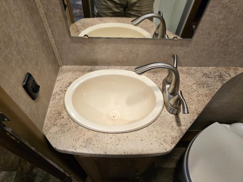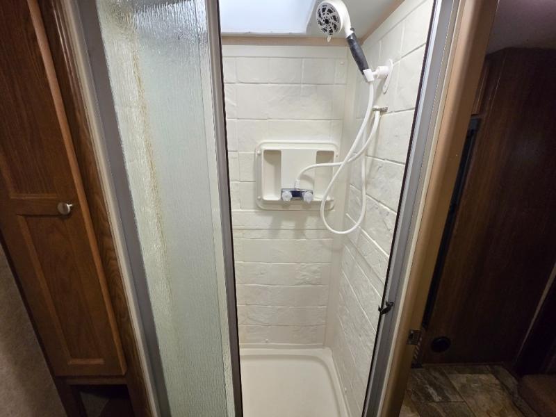 Heading toward the rear find a complete bath featuring a shower, toilet, sink, along with linen cabinet on the right side. Across the hall find a slide out set of bunk beds for the kids that is attached to the master bedroom wardrobe and dresser.