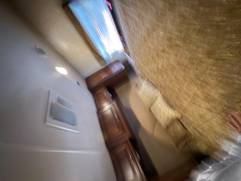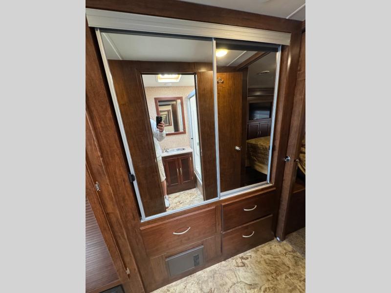 Continuing toward the rear of the coach find a large wardrobe for storage. Opposite along the road side there is a complete bath with a toilet, a vanity with sink, linen cabinet, and a tub/shower.