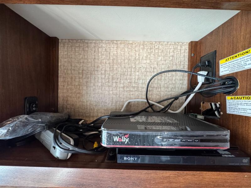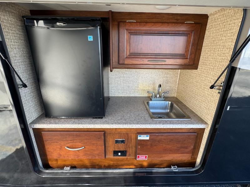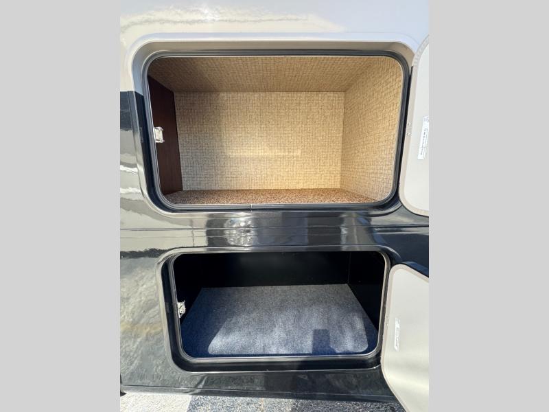 The very rear of this unit features a king size bed for comfortable sleeping, overhead storage, and bedside storage as well. Opposite the bed find a slide out with wardrobe space on either side of a flat screen TV including drawers, plus so much more!