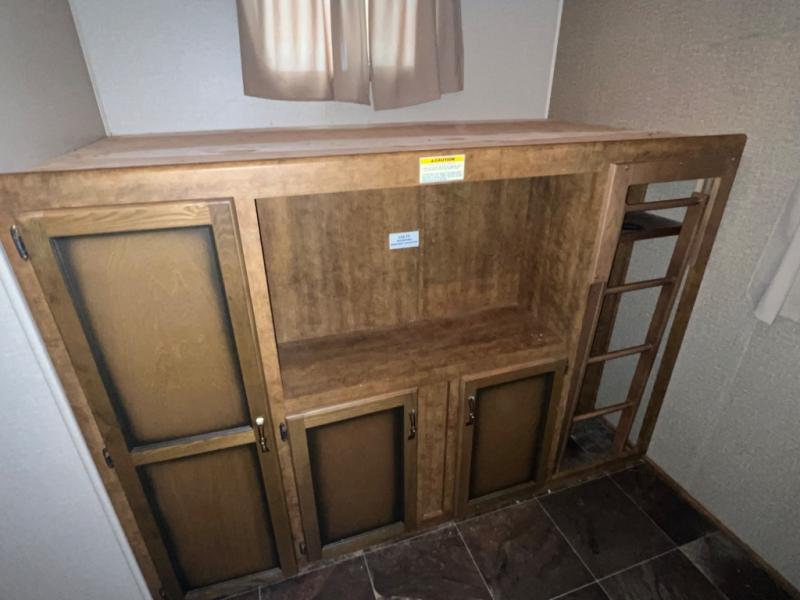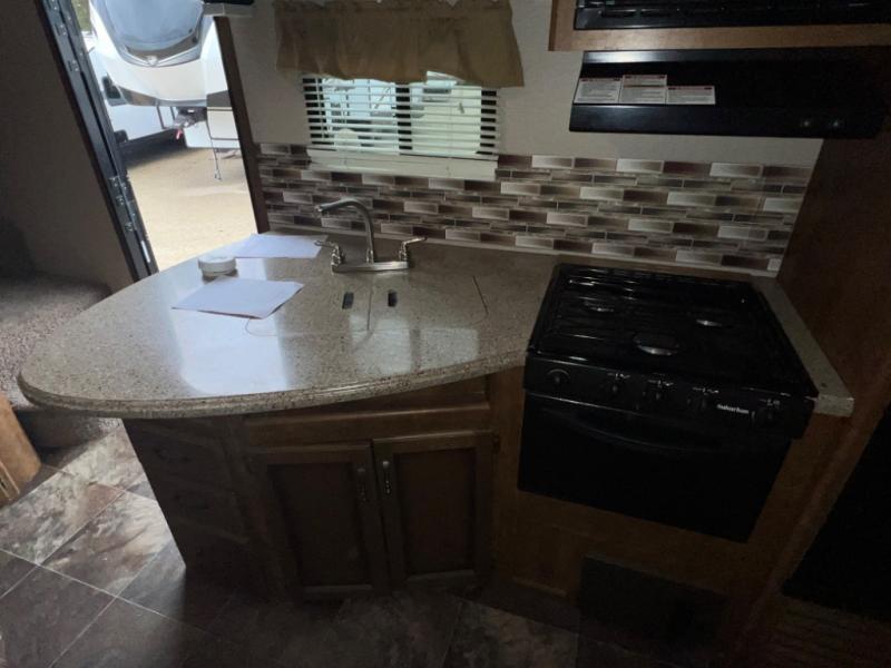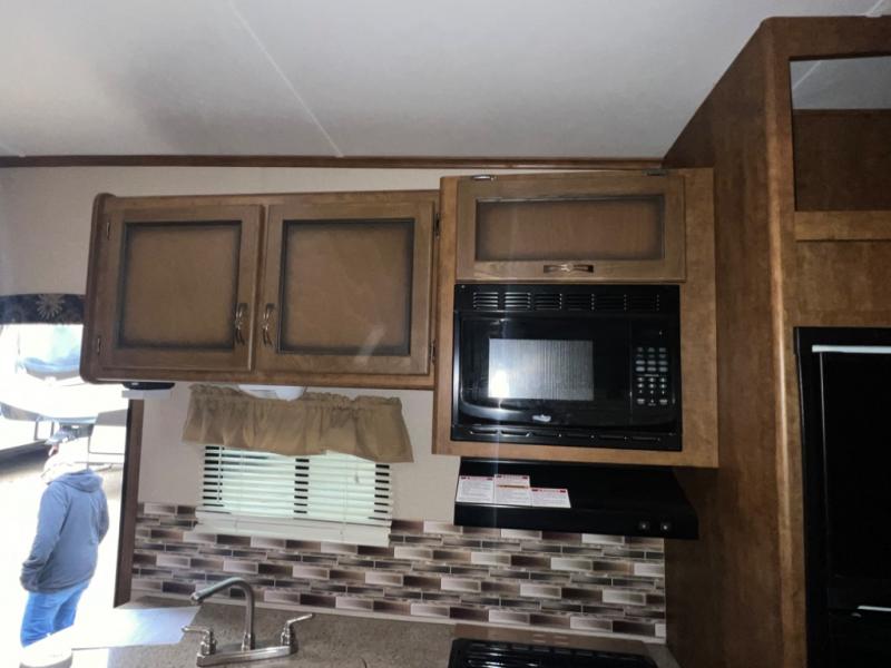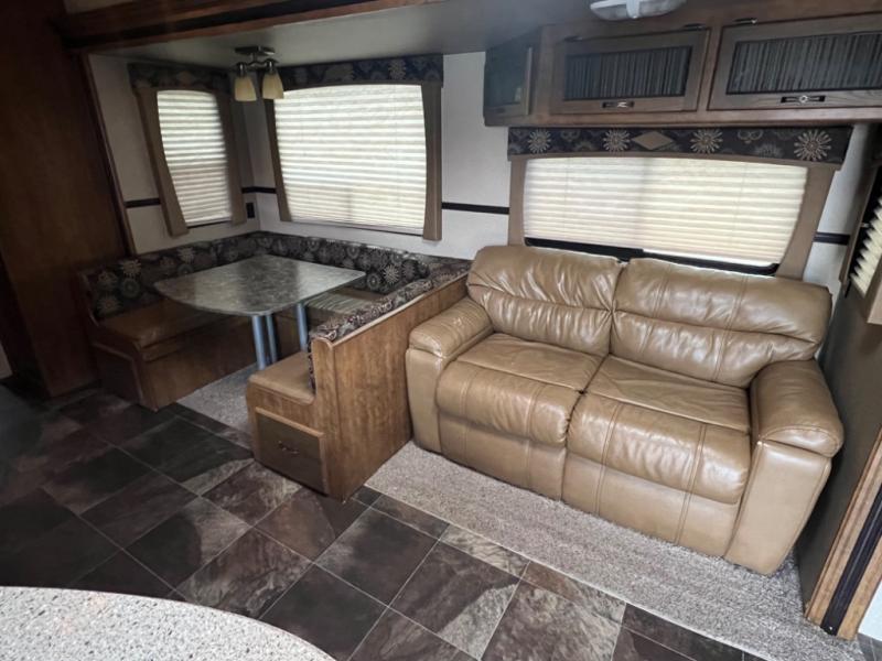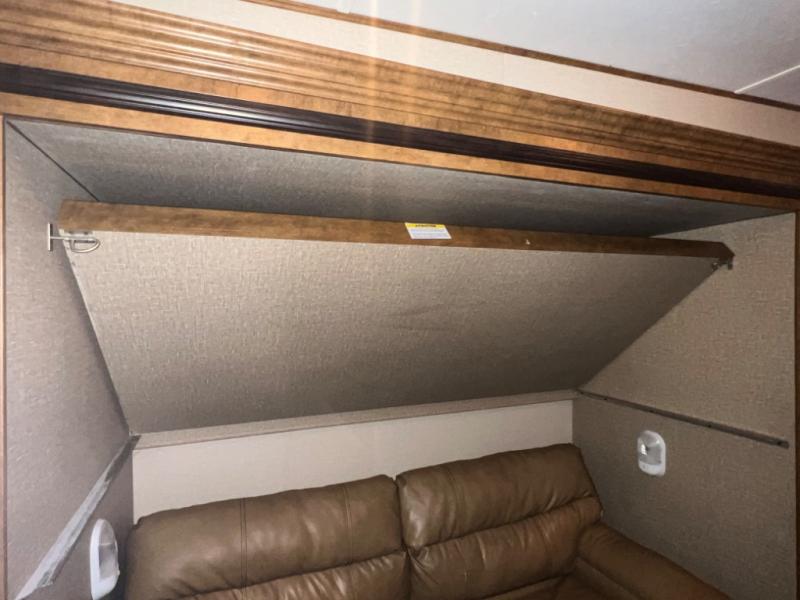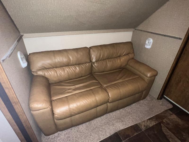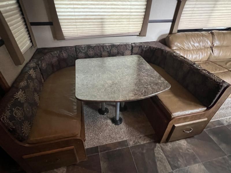 As you enter the fifth wheel, to the left is a double kitchen sink, range, microwave, and refrigerator. The opposite side has a slide with a sofa, overhead cabinet, and u-shaped dinette. Next to the dinette you will find a large pantry. In the front of the living and kitchen areas there is a nice entertainment center.