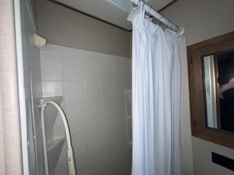 Stepping up the stairs, you will enter the bedroom. Inside the bedroom you will find a chest of drawers, wardrobe, and queen bed with overhead storage, as well as two shirt closets.