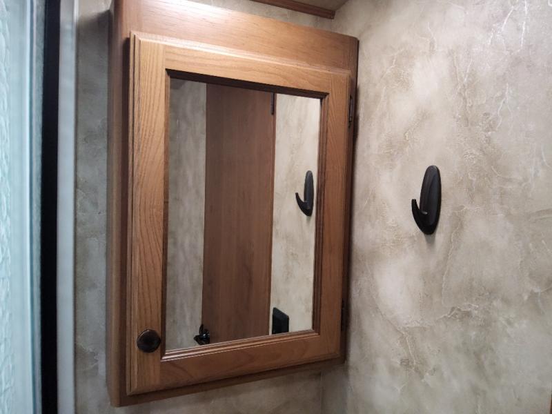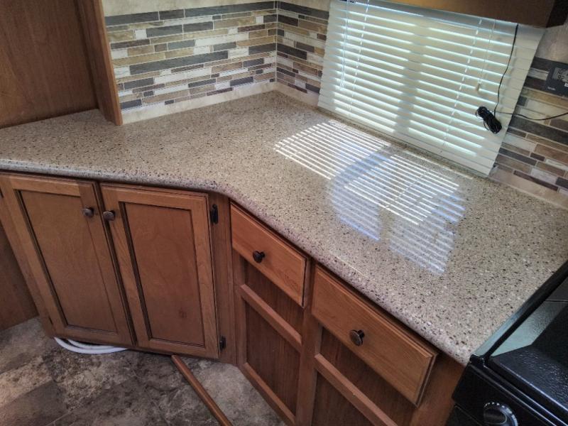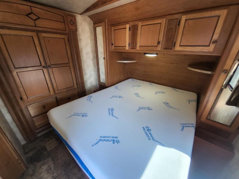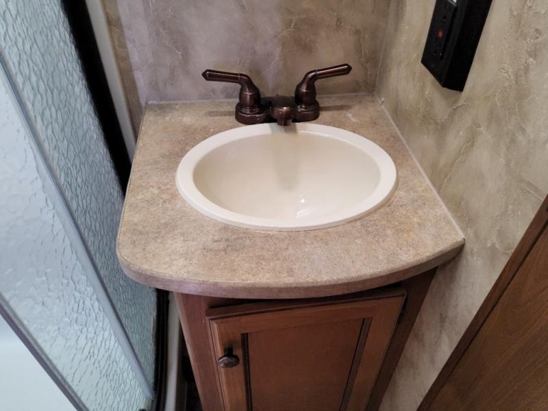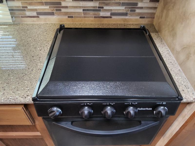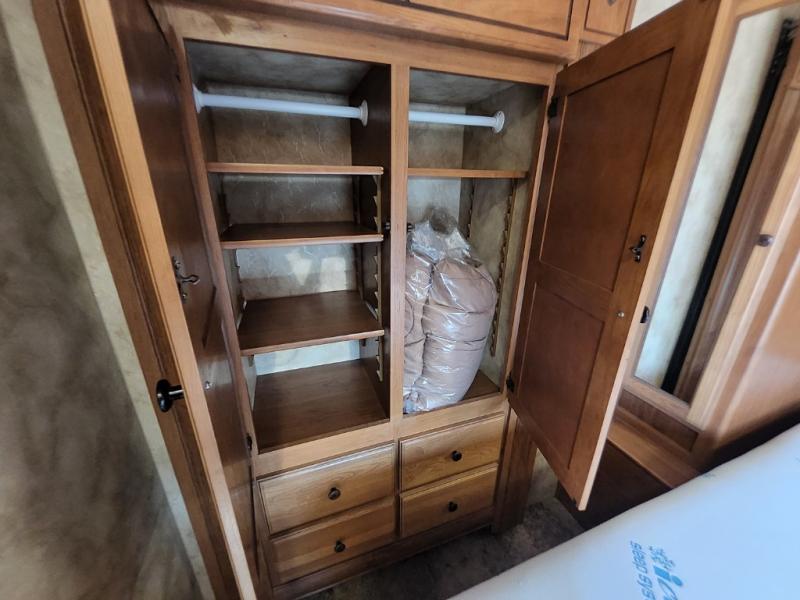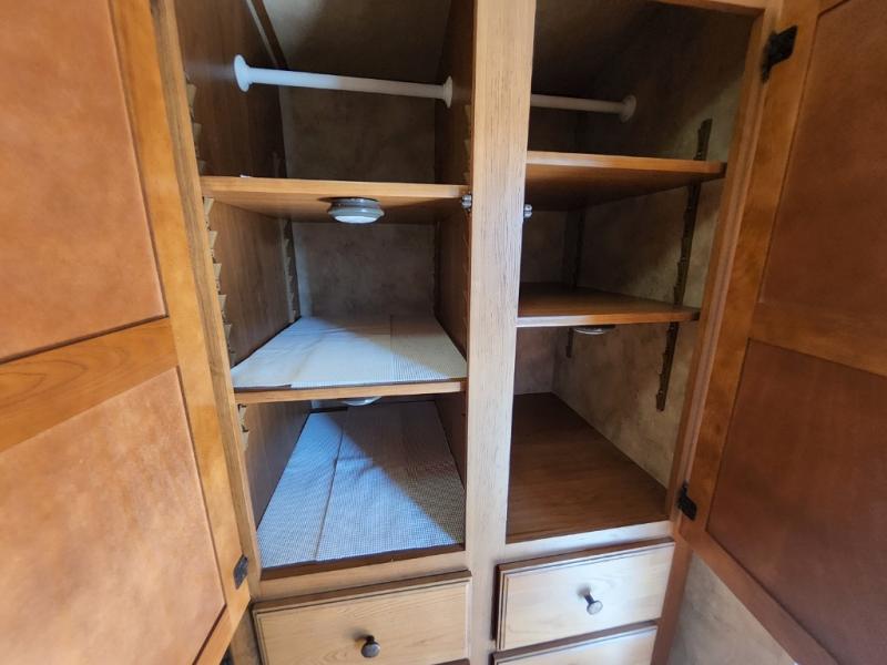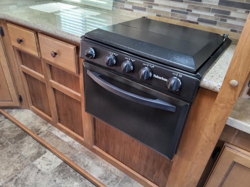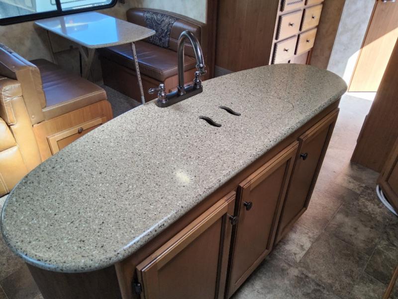 As you enter the travel trailer, to the left there is a corner linen cabinet and refrigerator. The slide offers extra counter space, a three burner range, and an entertainment center. On the opposite side of the travel trailer you will find a slide with two lounge chairs and a dinette. Next to the slide there is a large pantry/wardrobe. The kitchen island offers extra counter space and a double kitchen sink. Along the rear wall there is a sofa.