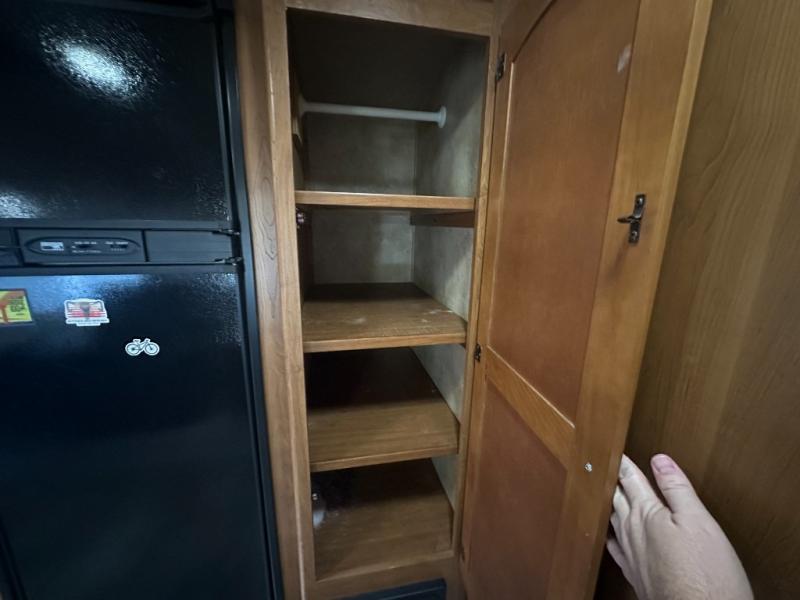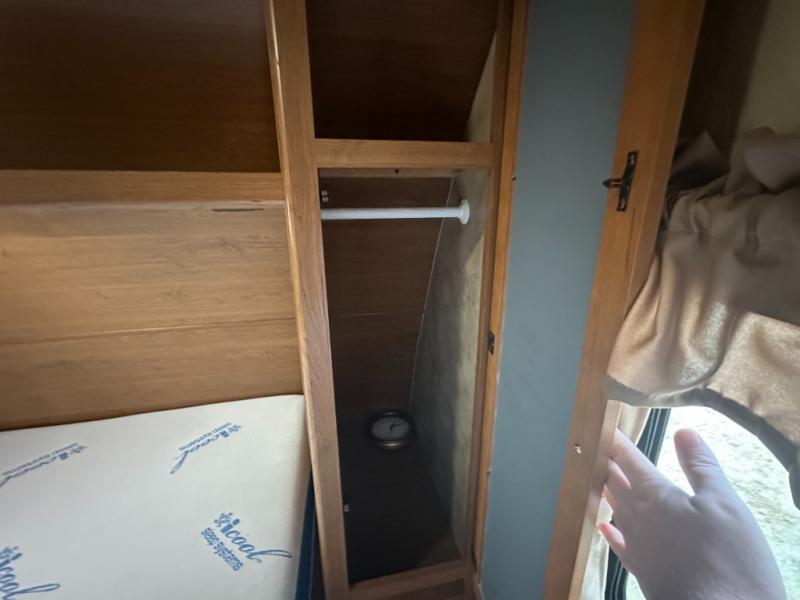 As you enter the travel trailer, to the right is a queen bed with wardrobes on either side of the bed.