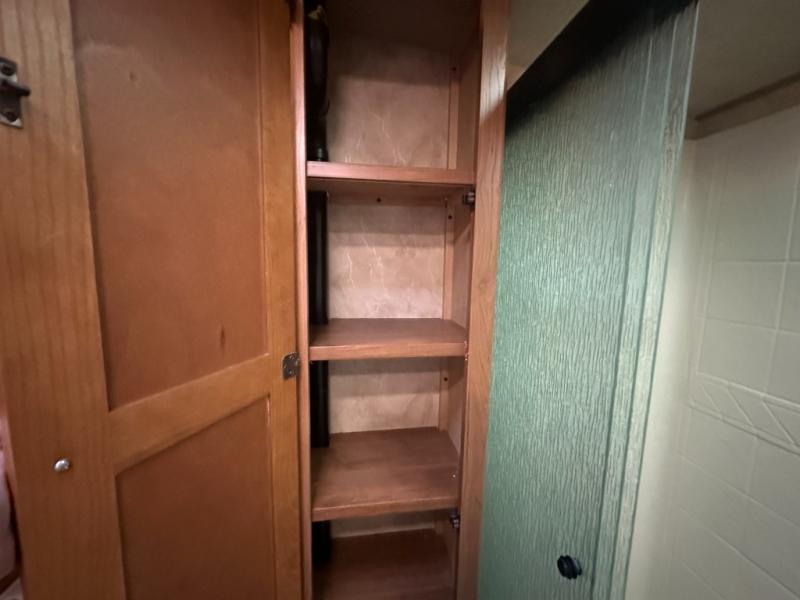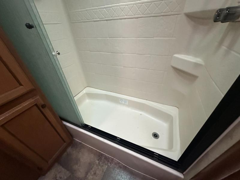 The rear bath offers a shower, linen cabinet, sink, and toilet.