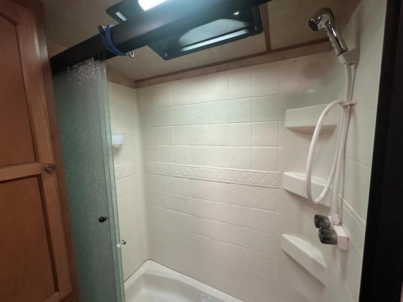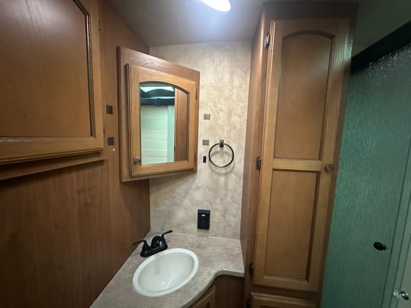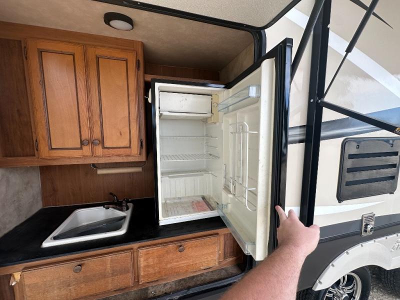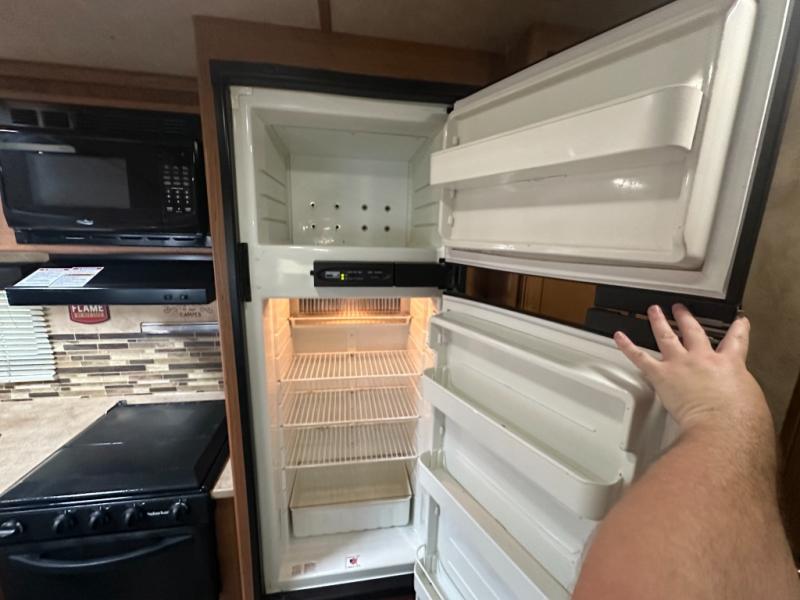 The main living area has a nice size entertainment center. There is a slide with a dinette and sofa. The opposite side has a double kitchen sink, three burner range, microwave, refrigerator, and wardrobe/pantry.
