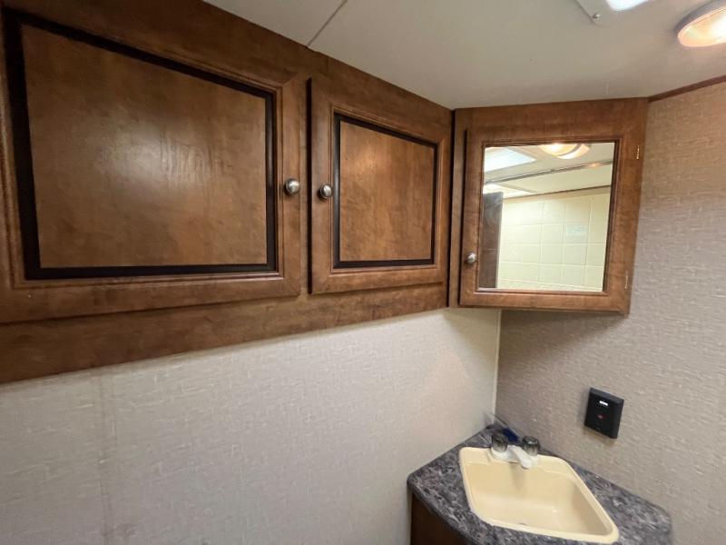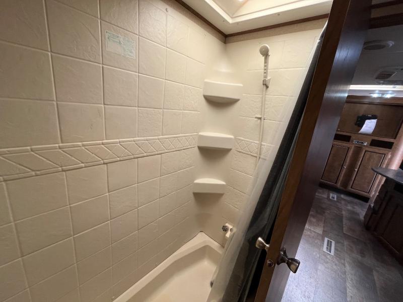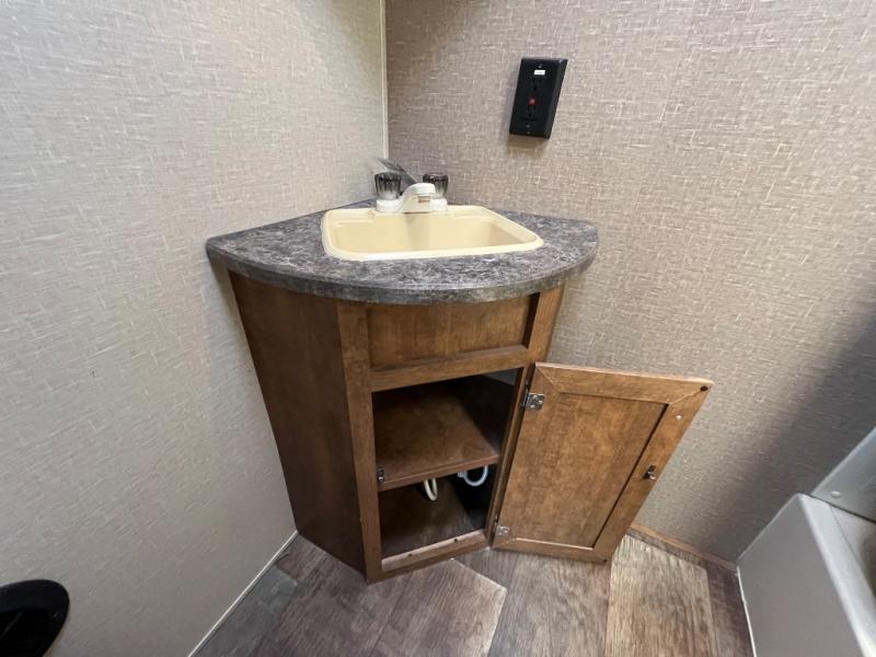 The bathroom is located in the rear of the trailer. Inside the bathroom you will find a tub, sink, and toilet.