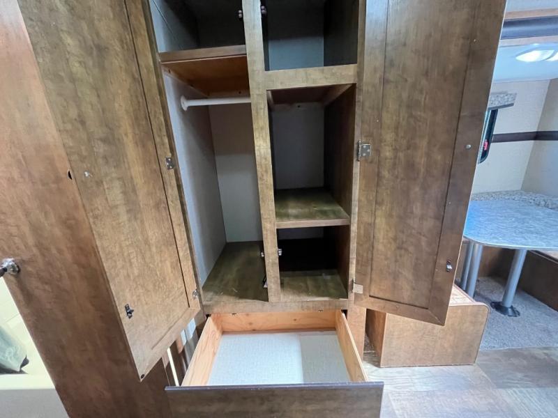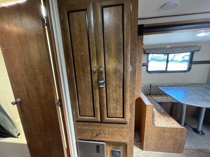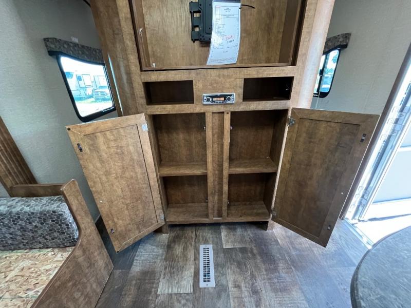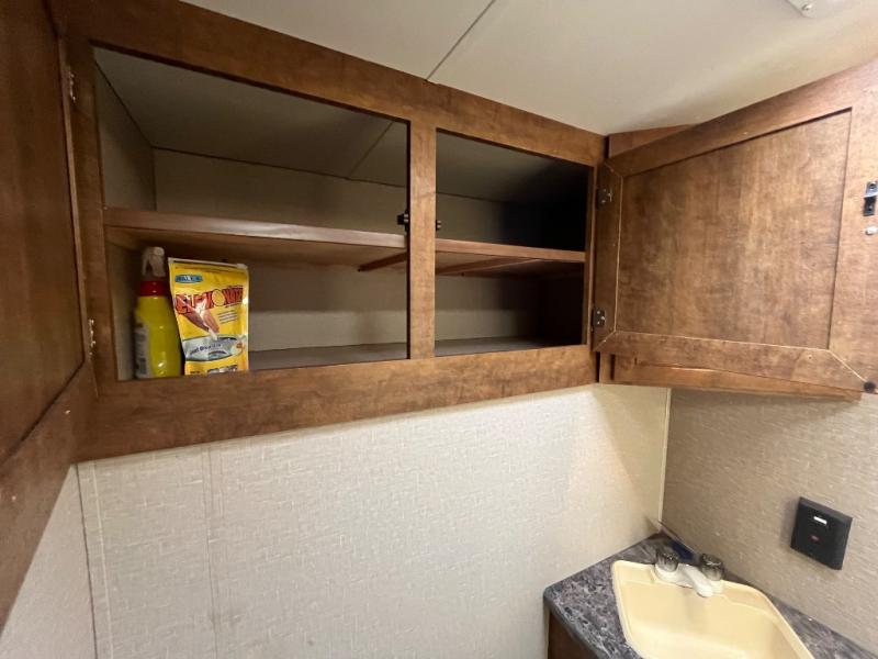 Upon entering the travel trailer you will find to your left a double kitchen sink, three burner range, microwave, and refrigerator. On the opposite side of the trailer there is a u-shaped dinette slide where you can enjoy meals during the day, and at night you can use this space for extra sleeping room. Next to the slide there is nice size pantry and wardrobe. Along the front of the kitchen/living area you can enjoy watching TV at the entertainment center.