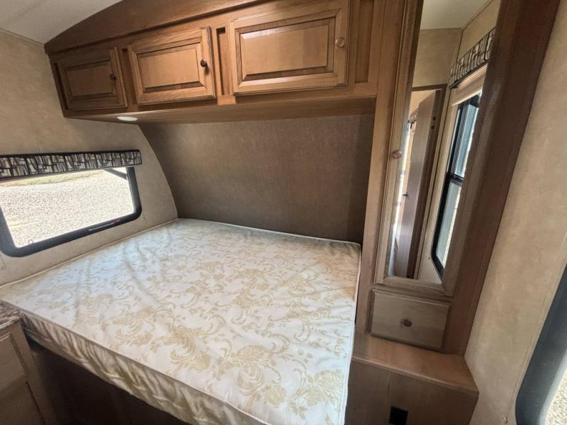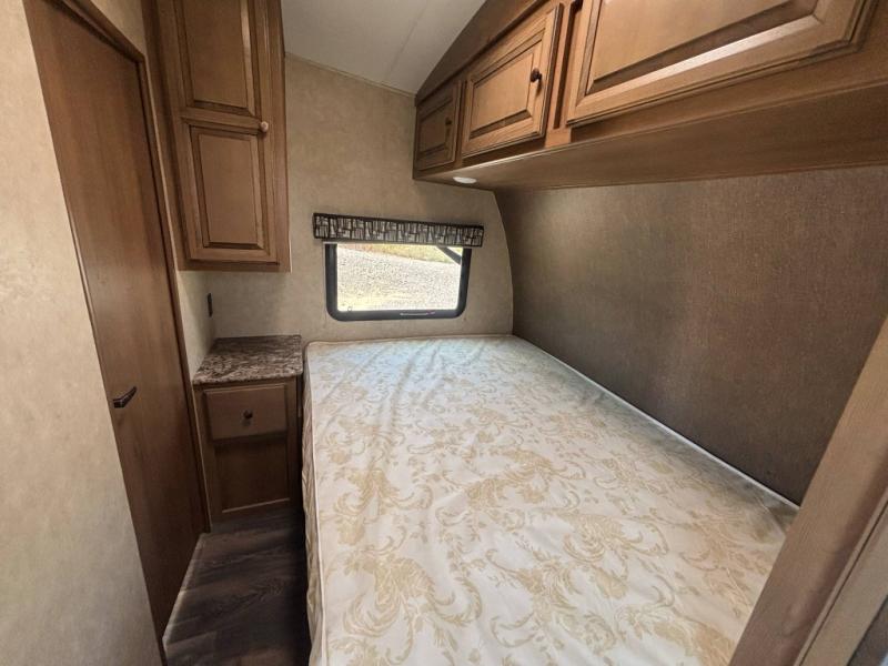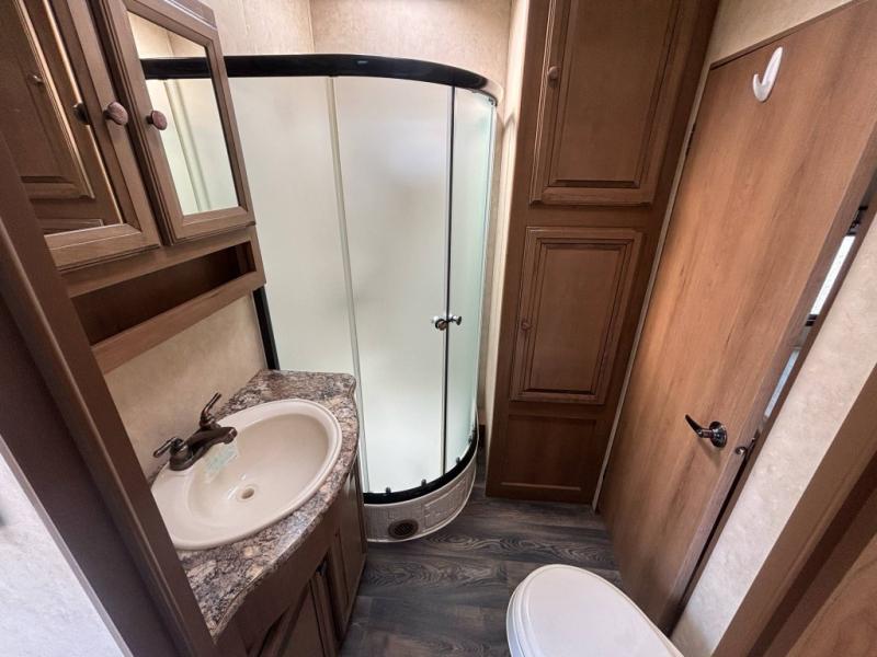 Head up front to a side aisle bath where you can easily clean-up with a corner shower, linen cabinet, sink with medicine cabinet, plus toilet. There is a second bathroom door that leads directly into the front master bedroom where you will find a lift-up queen bed, wardrobe storage, and so much more!