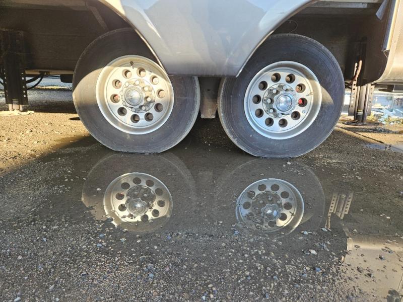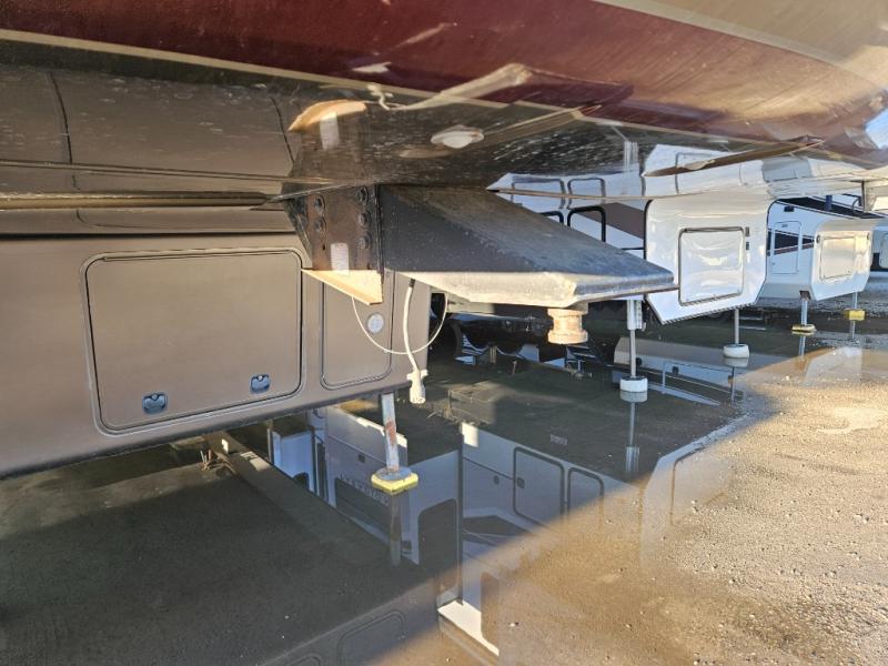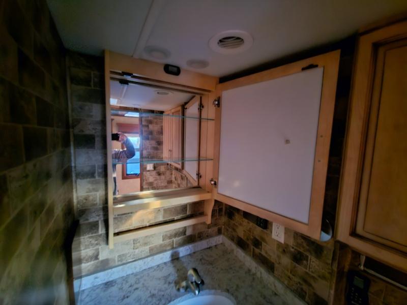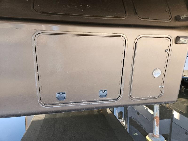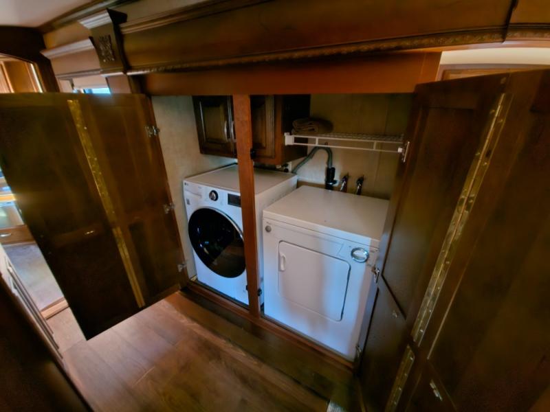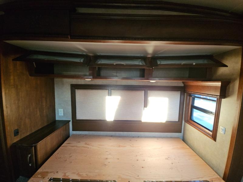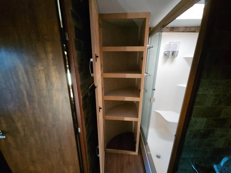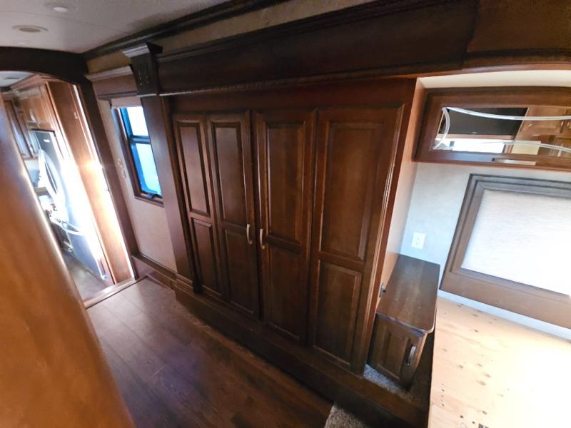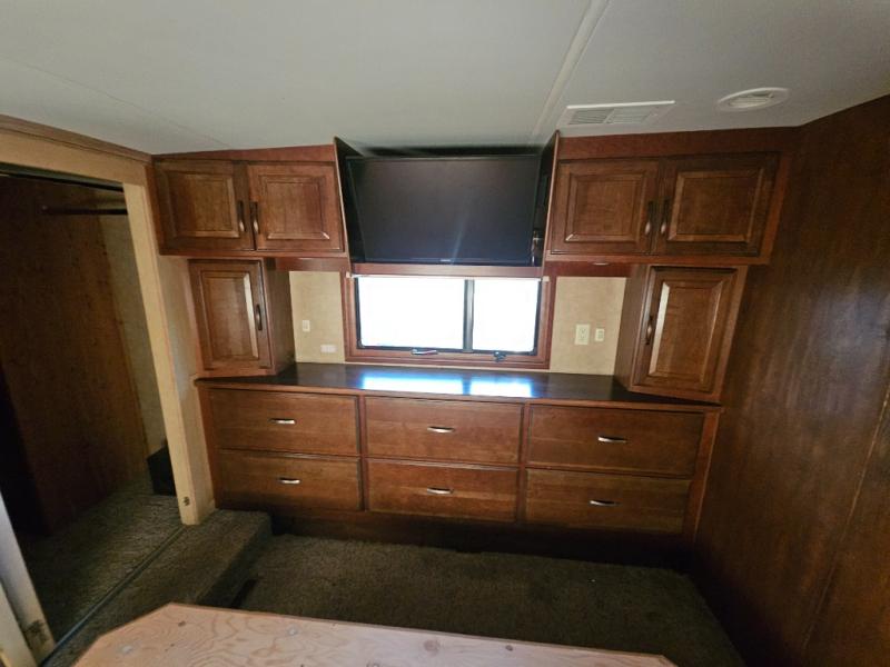 Just outside the bathroom door find a slide out wardrobe with washer and dryer space, plus a king bed and nightstand further into the bedroom within the same slide. You will also find a vanity with drawers including a TV above opposite the bed, and overhead storage on either side. The front wall features a walk-in closet with shelves and a dresser, plus closet organizer, and so much more!
