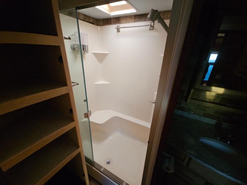 Head up the steps just off the refrigerator slide to the front bed and bath. The bath offers a 48" tub/shower, a vanity with sink, toilet and linen cabinet.