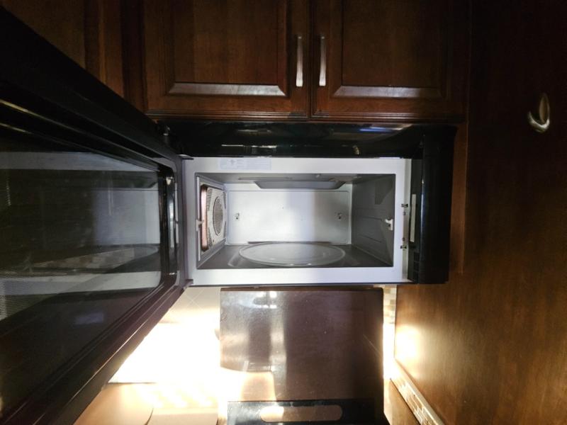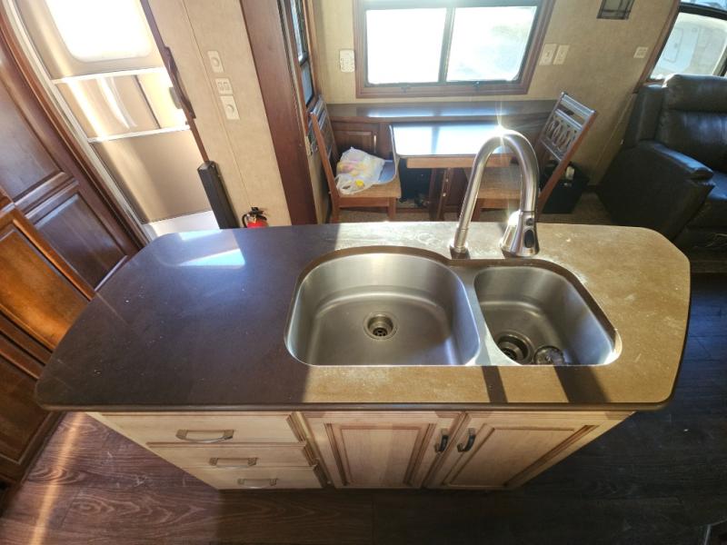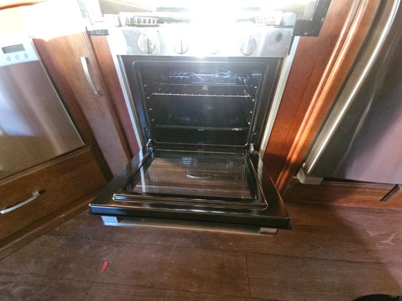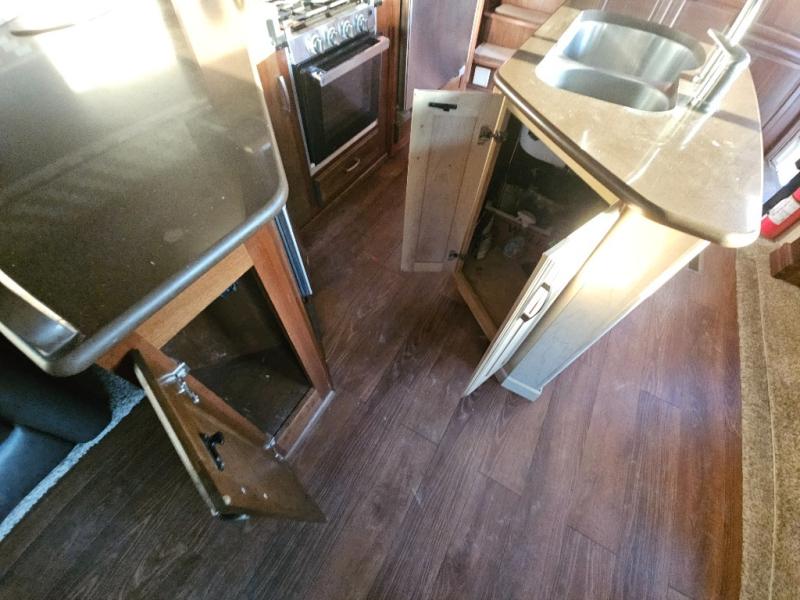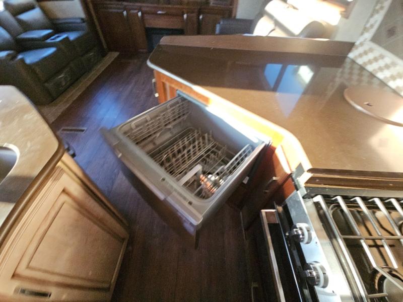 The kitchen is straight ahead through the entry door and features a pantry along the interior wall, a convenient kitchen island with dual sinks, and a slide out refrigerator, three burner range, and counter space with overhead storage. There is also a microwave within the slide that also includes the L-shaped sofa.
