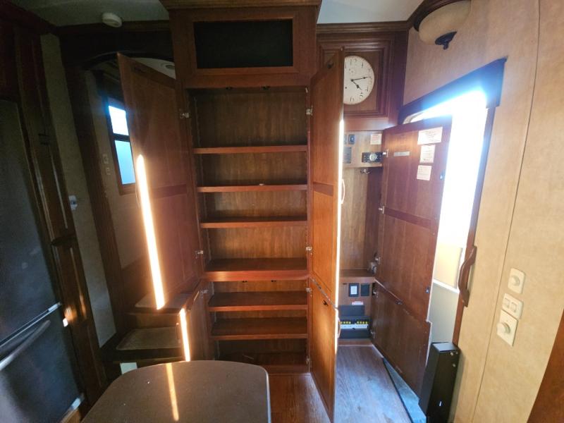 To the left of the entrance enjoy a dining table with two chairs, two recliners, and overhead cabinets the entire width of the slide. Along the rear wall find a power lift TV with side curio cabinets, overhead storage, and an optional fireplace.