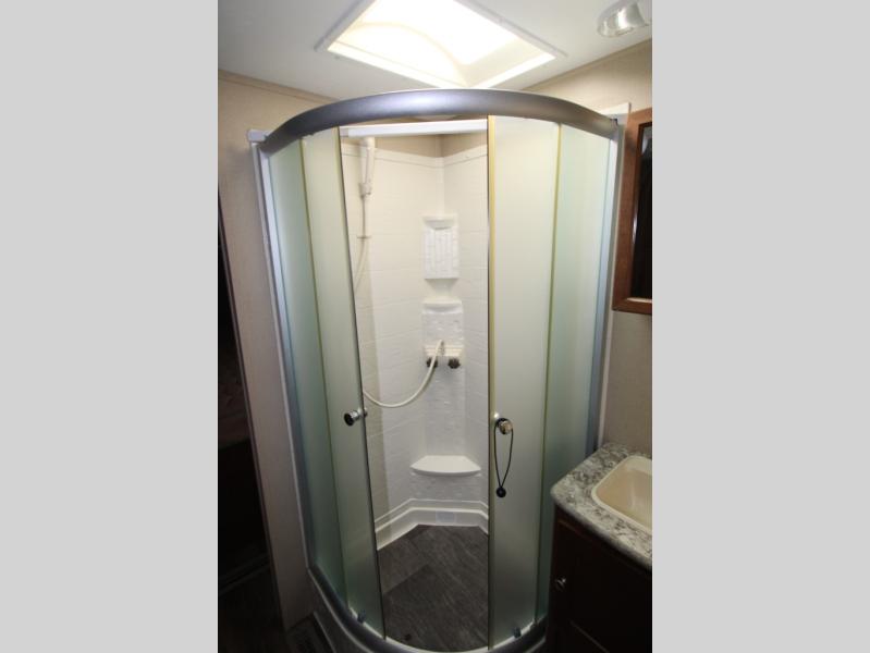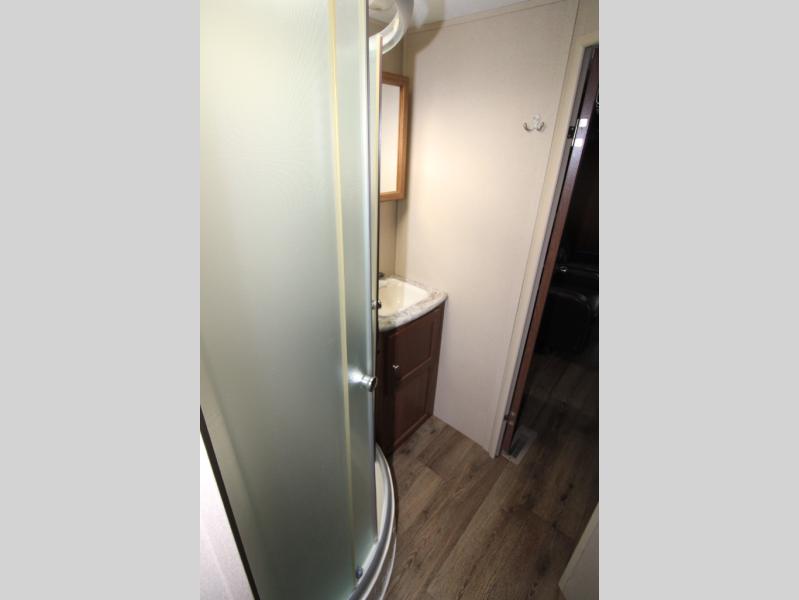 A walk-through bath to your right as you head up front features a corner 32" radius shower and sink on the right and toilet with linen storage above on the left.