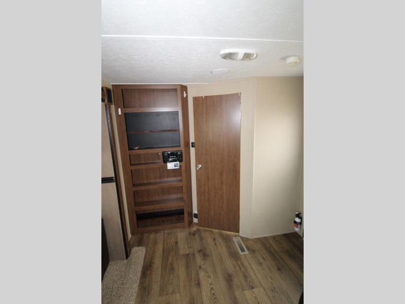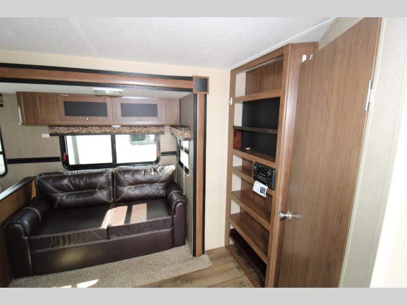 To the left of the entry door find two lounge chairs with storage above both. Opposite enjoy the space created by a large slide out 68" sofa, and booth dinette. Both can be used for seating and added sleeping space if needed at night. There is also an entertainment center nearby for your enjoyment.